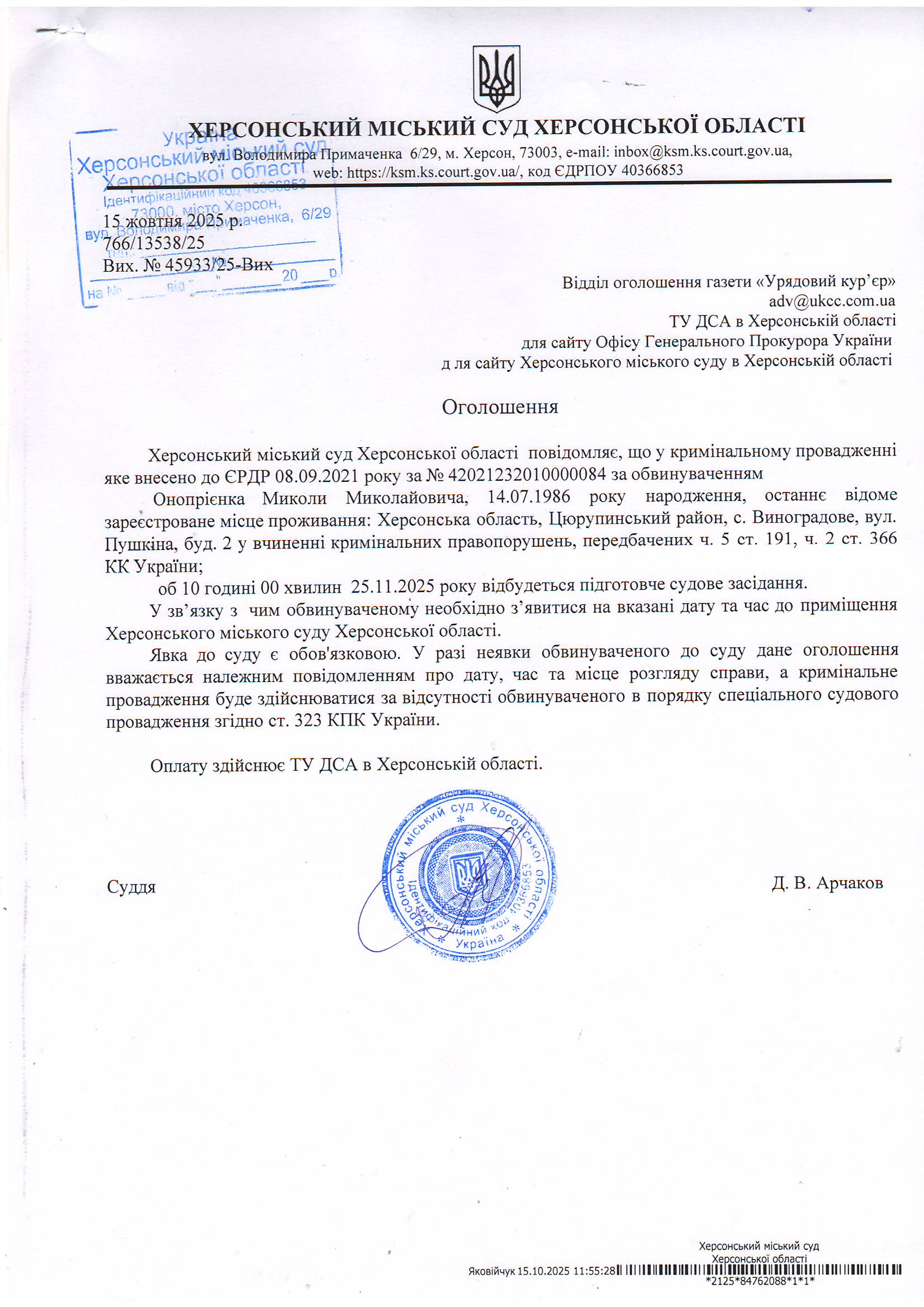 Оголошення для Онопрієнка Миколи Миколаєвича
