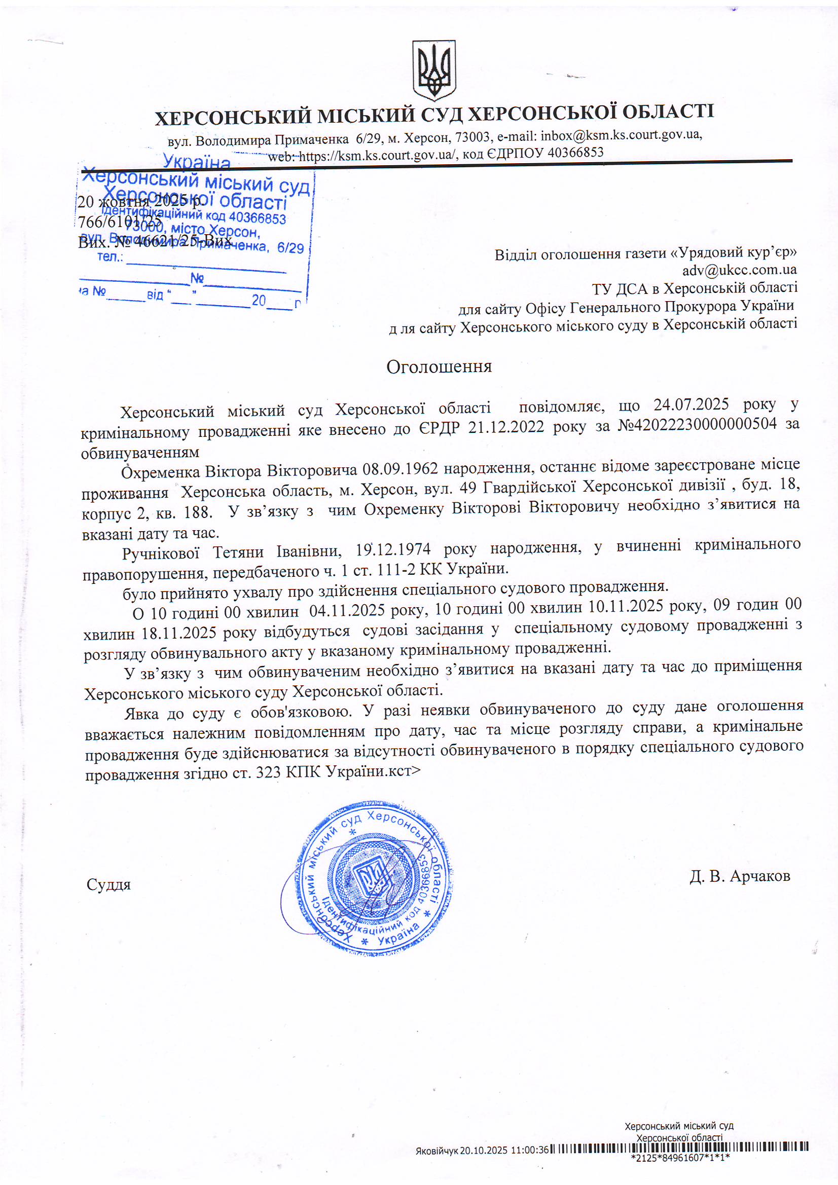 Оголошення про виклик особи в суд та повідомлення про судове рішення