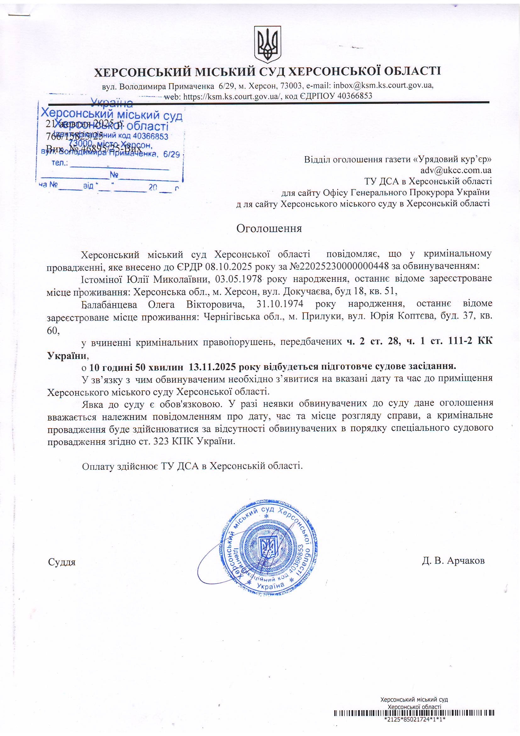 Оголошення для Істоміної Юлії Миколаївни, Балабанцева Олега Вікторовича