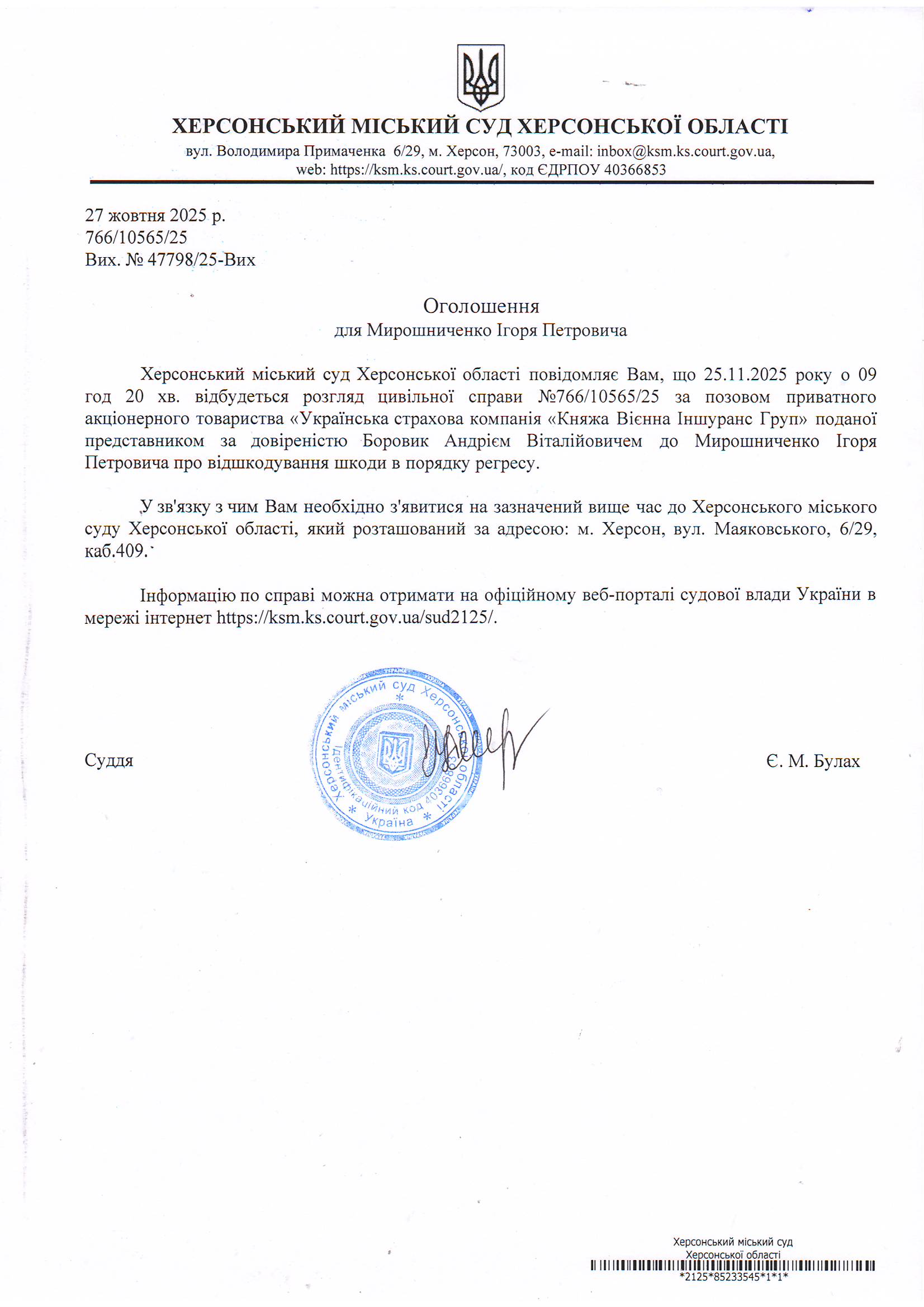ОГОЛОШЕННЯ ПРО ВИКЛИК ДО СУДУ