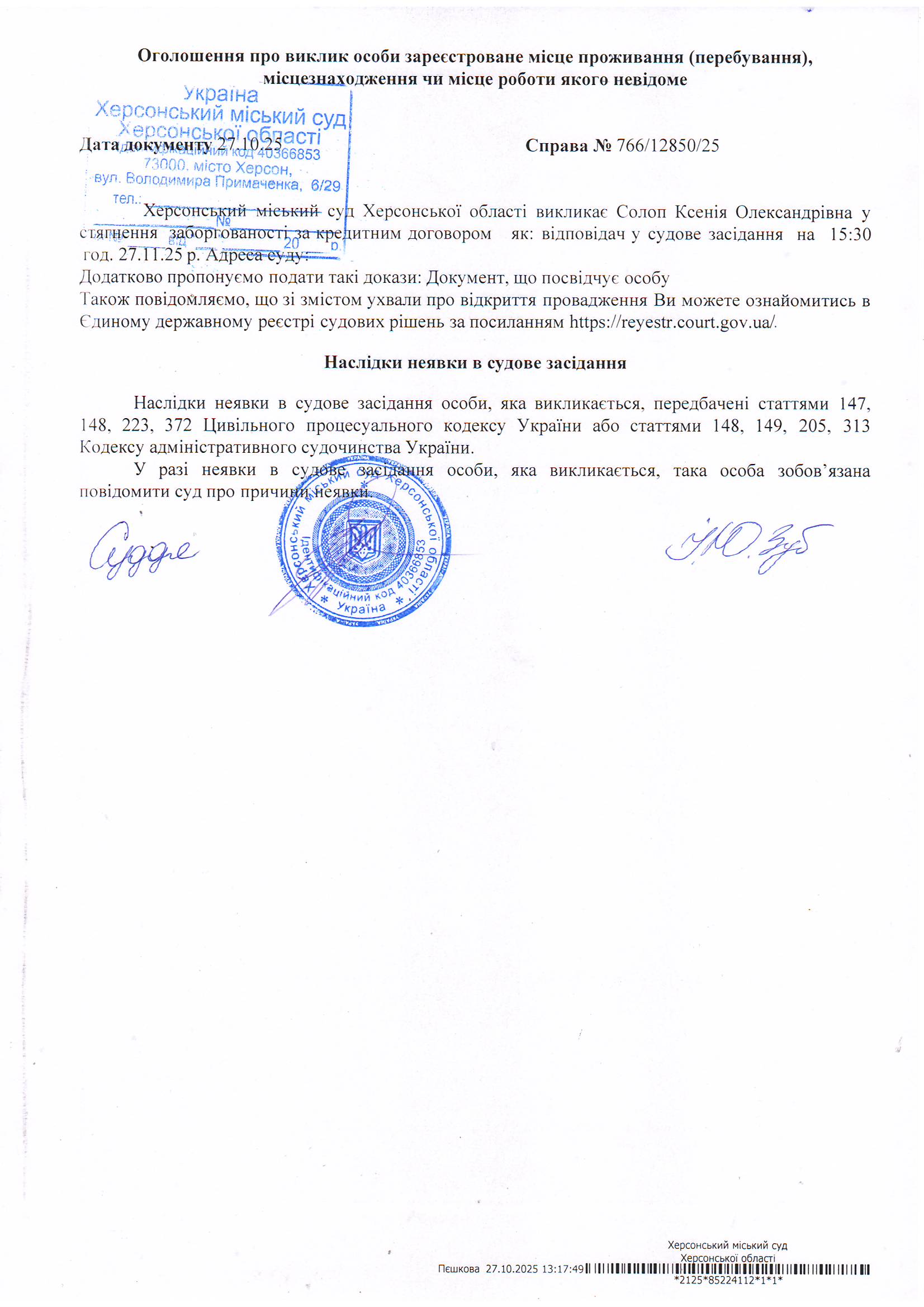 ОГОЛОШЕННЯ ПРО ВИКЛИК ДО СУДУ