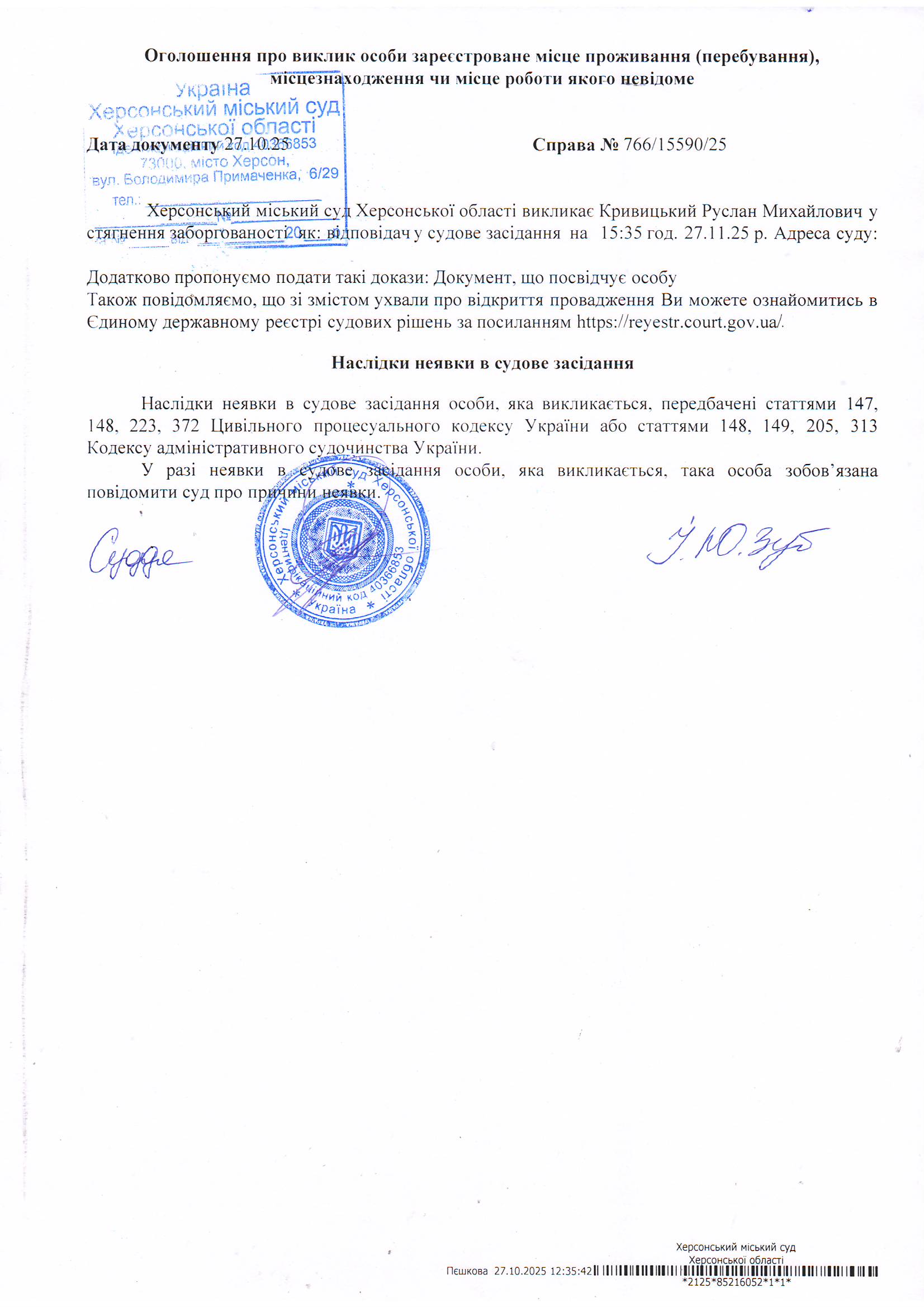 Оголошення про виклик особи в суд та повідомлення про судове рішення