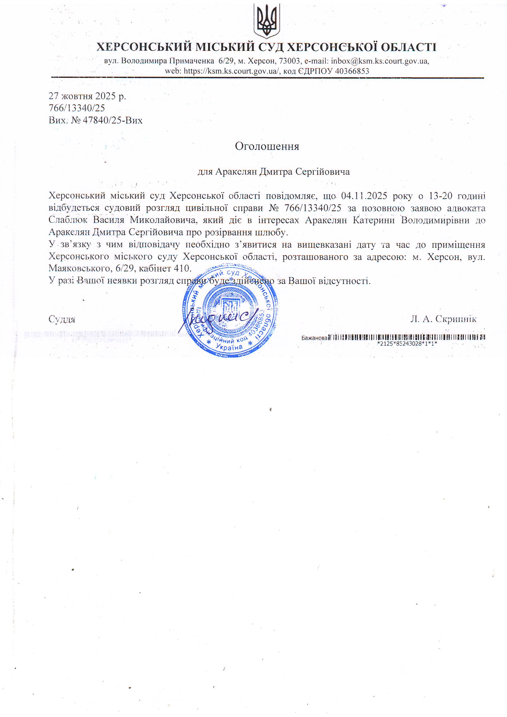 Оголошення про виклик особи в суд та повідомлення про судове рішення