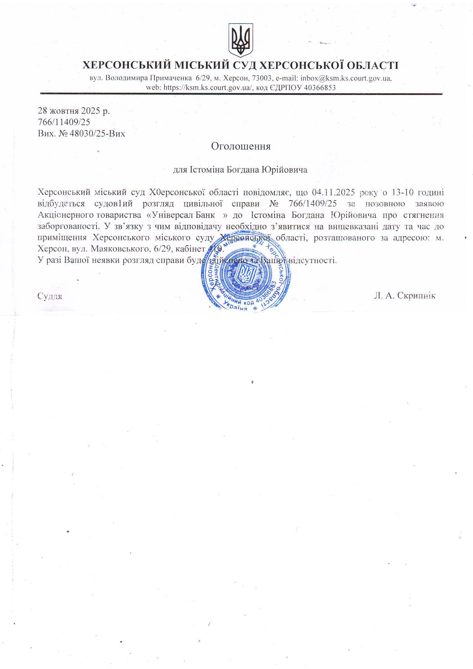 ОГОЛОШЕННЯ ПРО ВИКЛИК ДО СУДУ