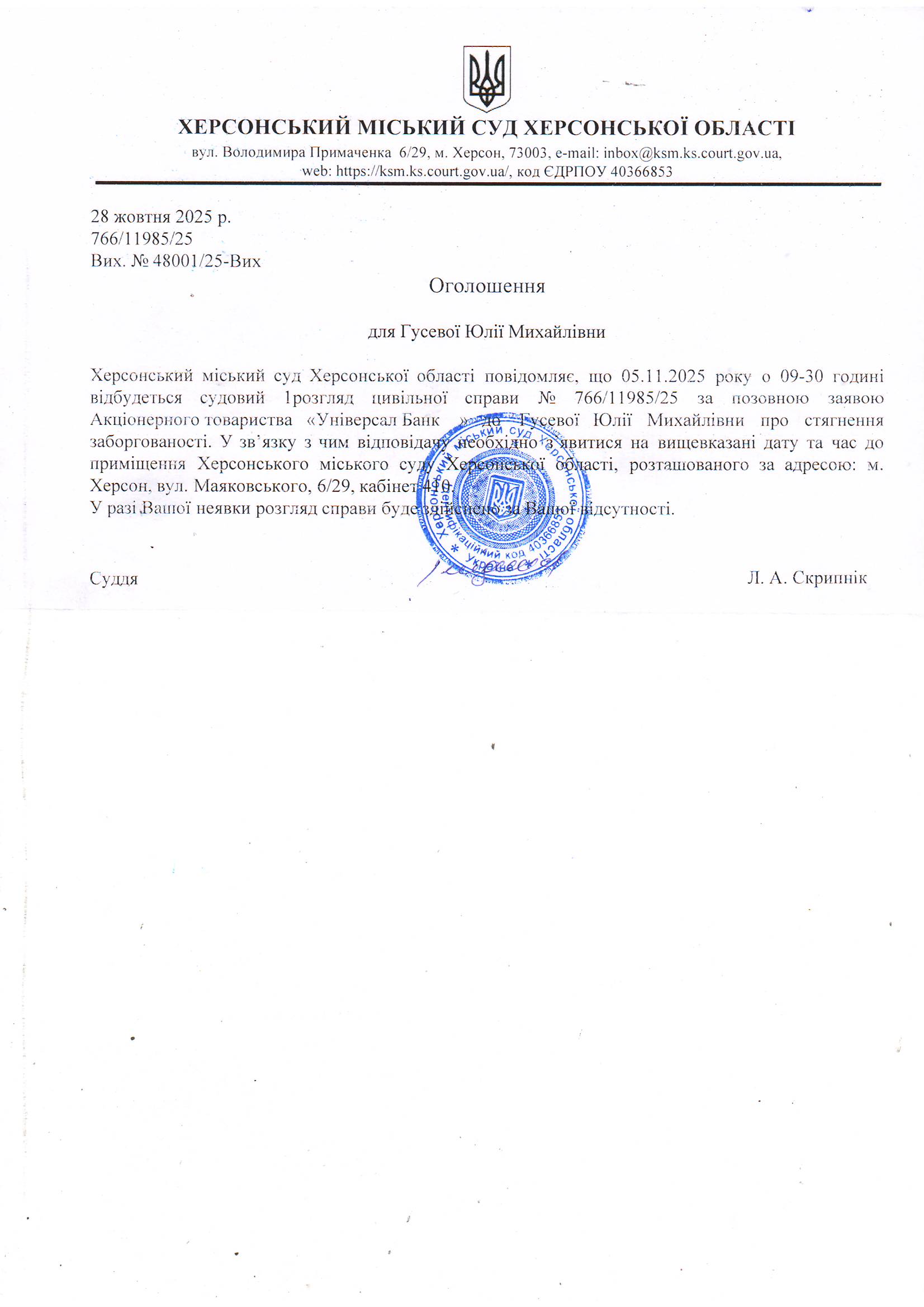 ОГОЛОШЕННЯ ПРО ВИКЛИК ДО СУДУ