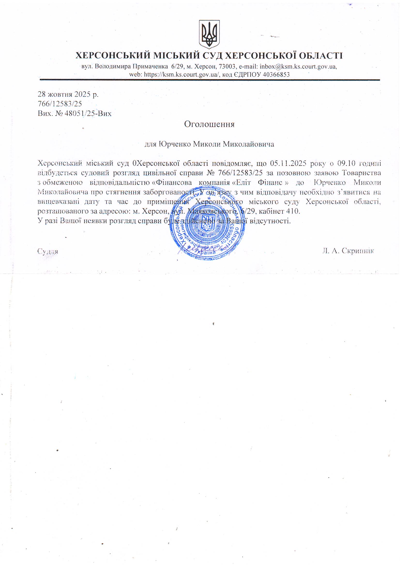 ОГОЛОШЕННЯ ПРО ВИКЛИК ДО СУДУ
