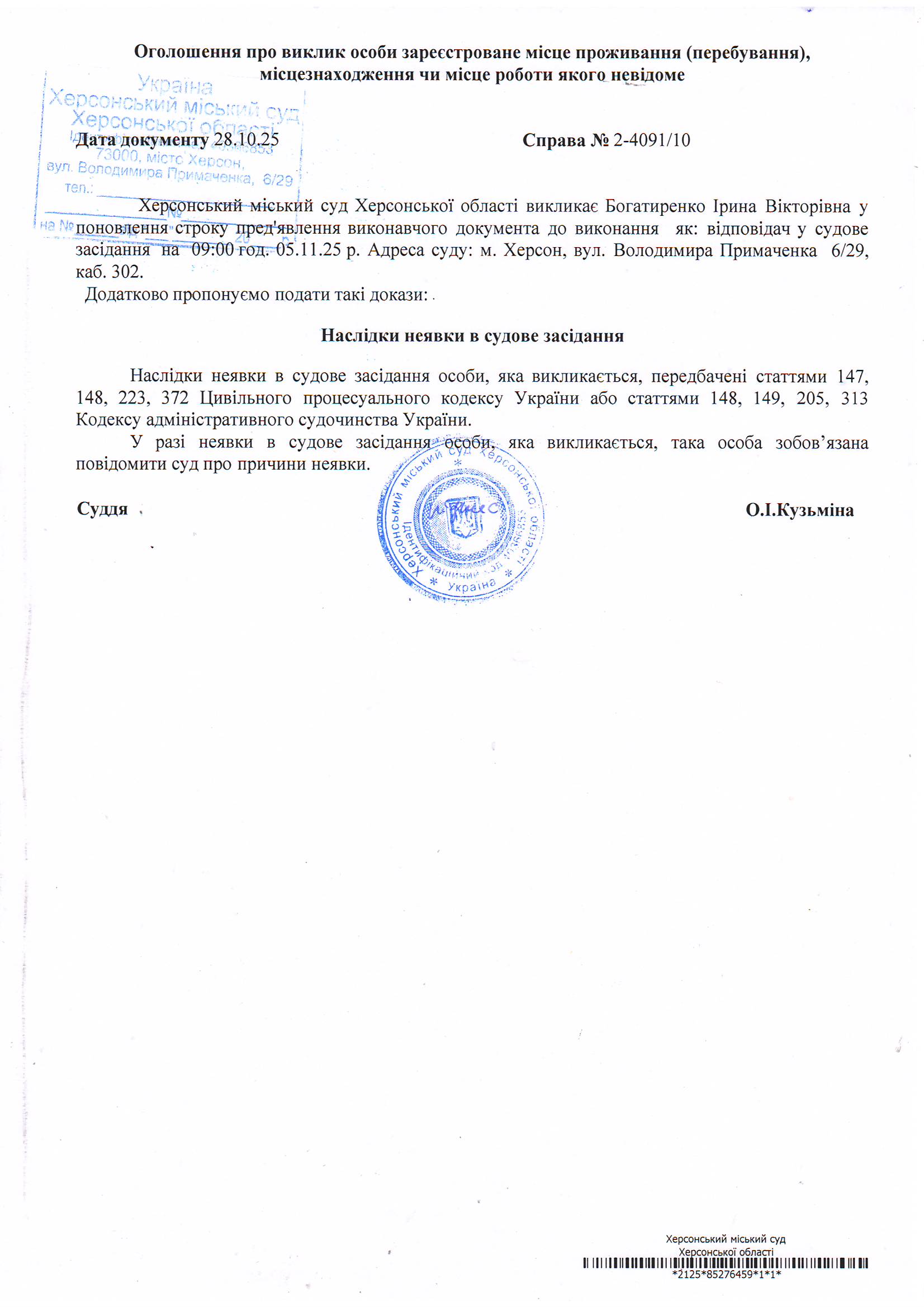 ОГОЛОШЕННЯ ПРО ВИКЛИК ДО СУДУ