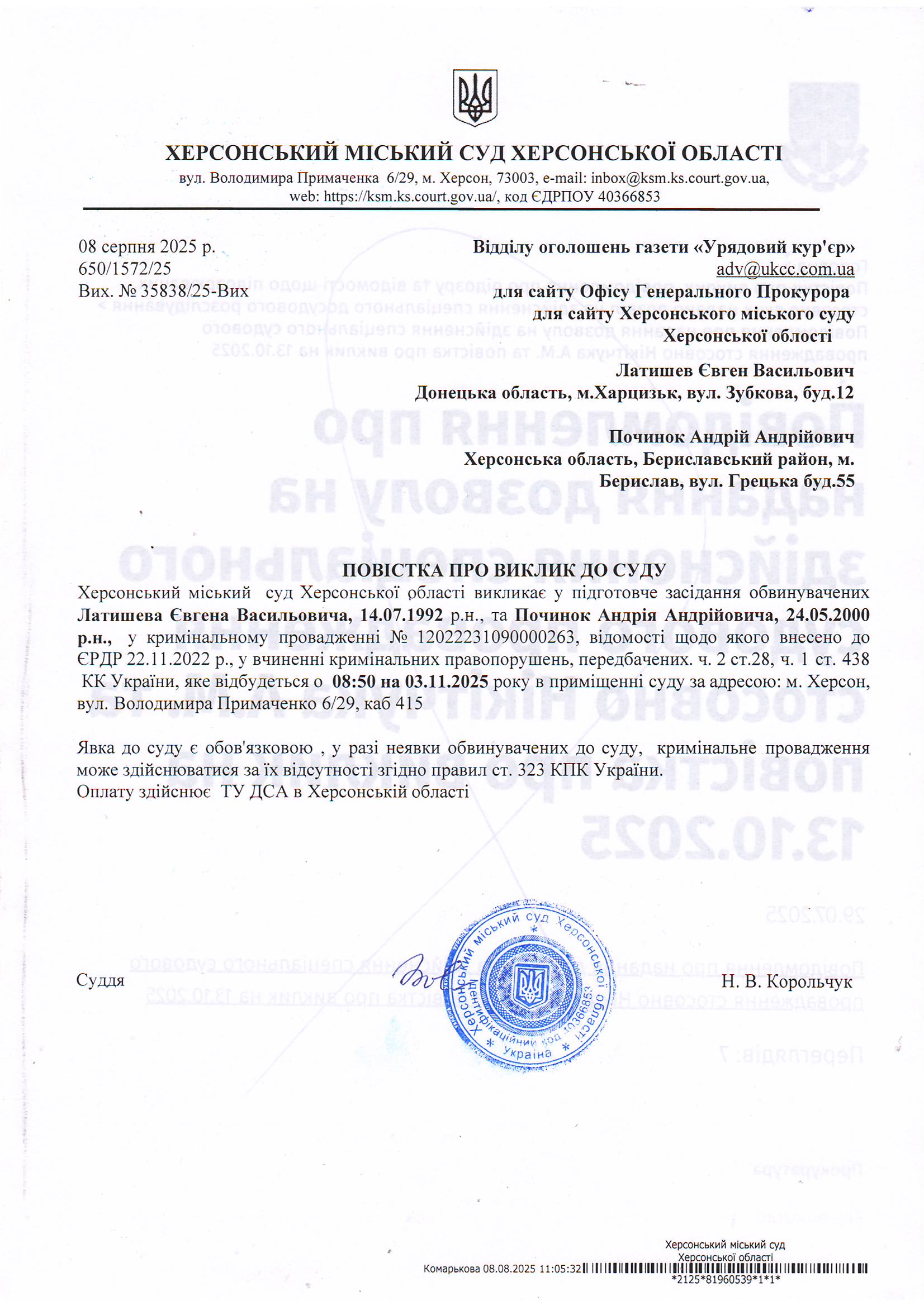 Оголошення для Латишева Євгена Васильовича, Починок Андрія Андрійовича