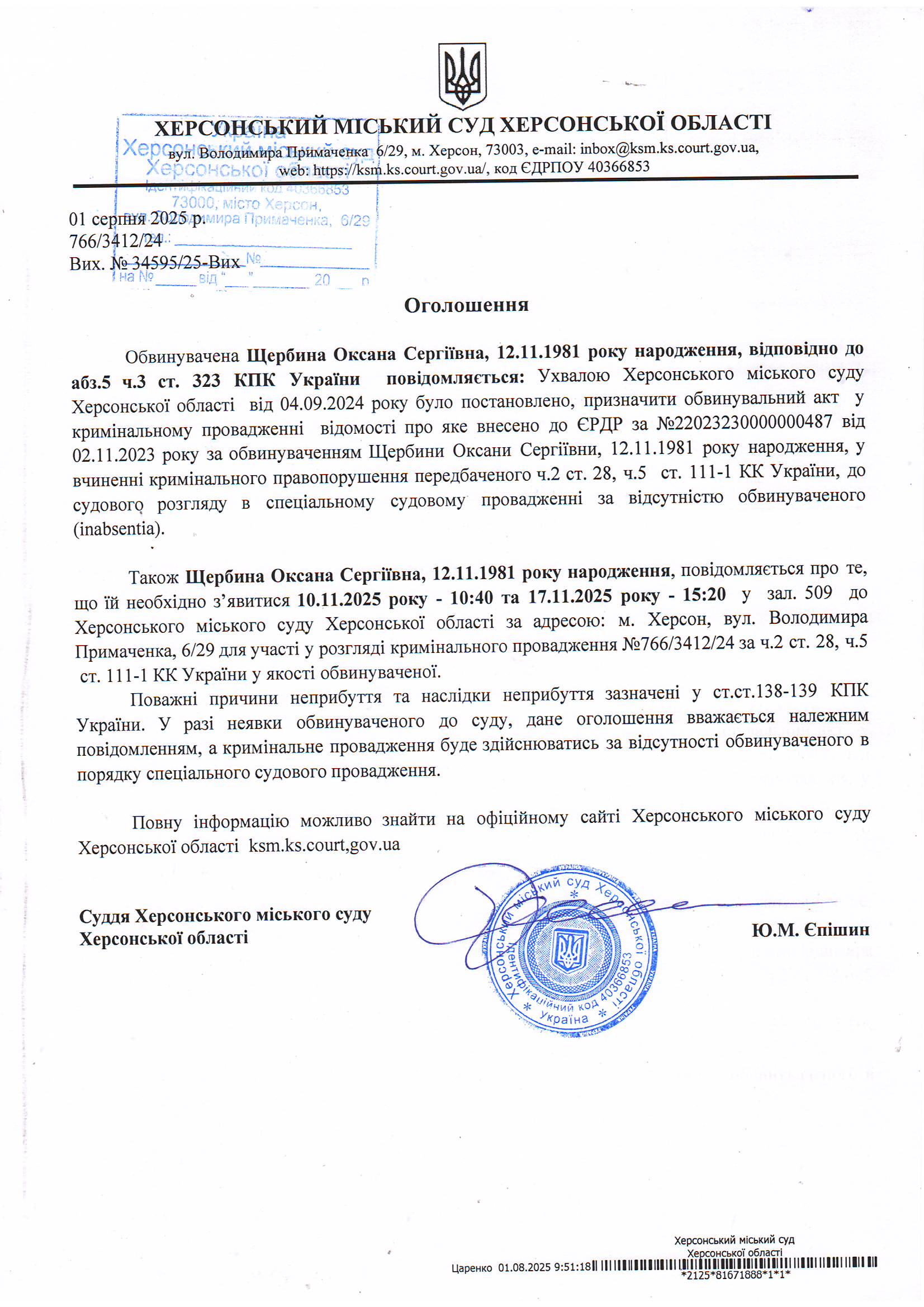 Оголошення про виклик особи в суд та повідомлення про судове рішення