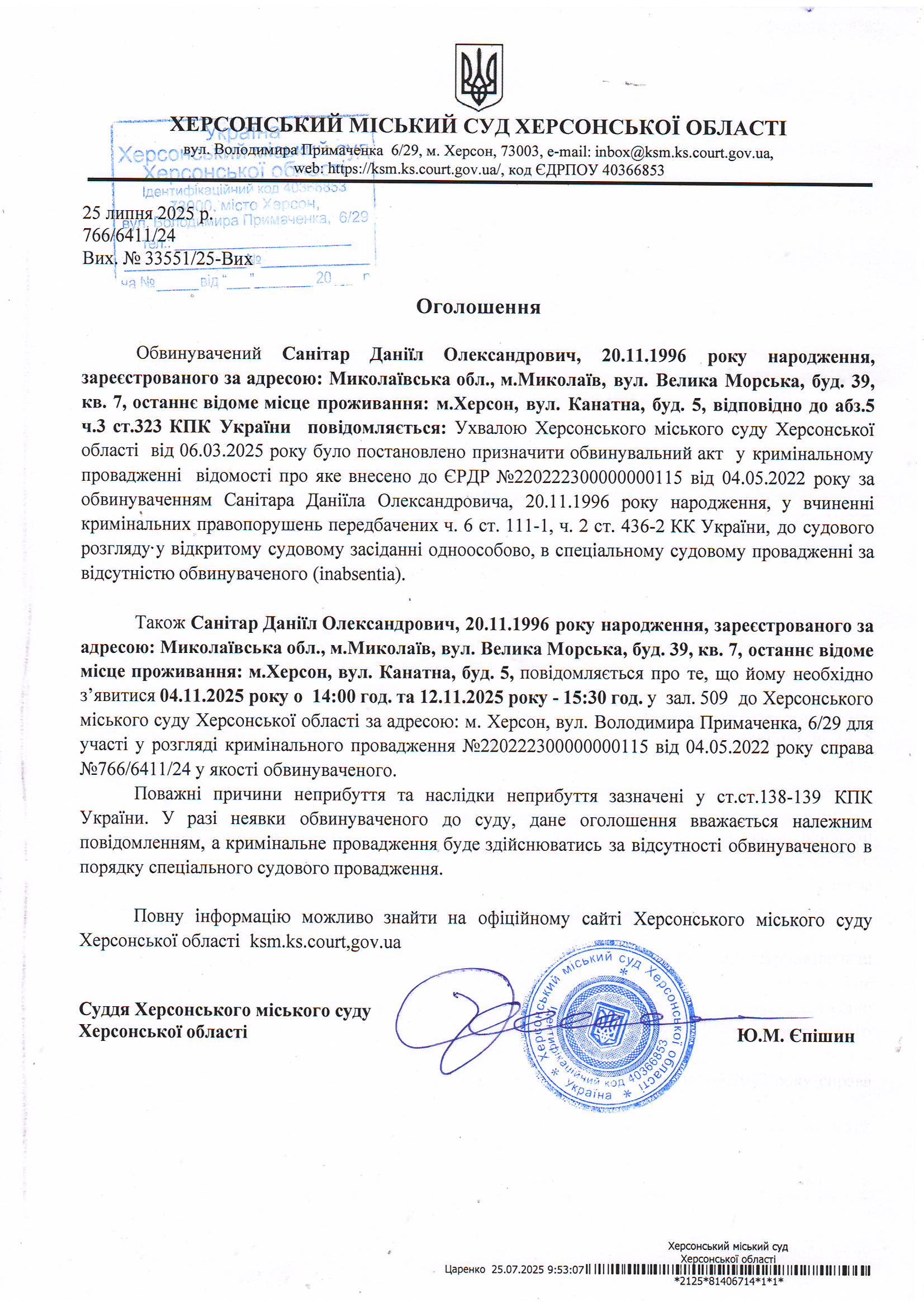Оголошення про виклик особи в суд та повідомлення про судове рішення