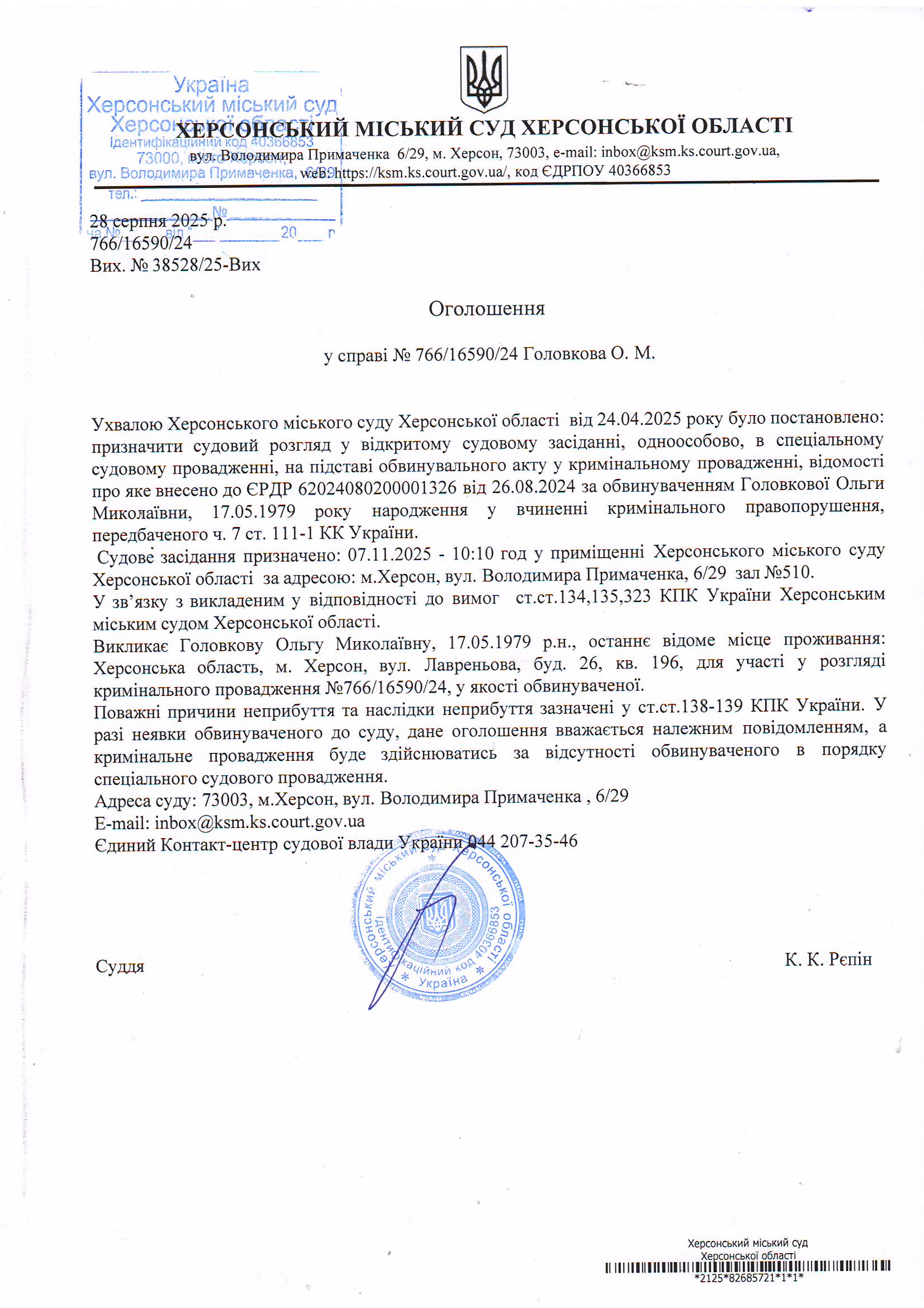 ОГОЛОШЕННЯ ПРО ВИКЛИК ДО СУДУ