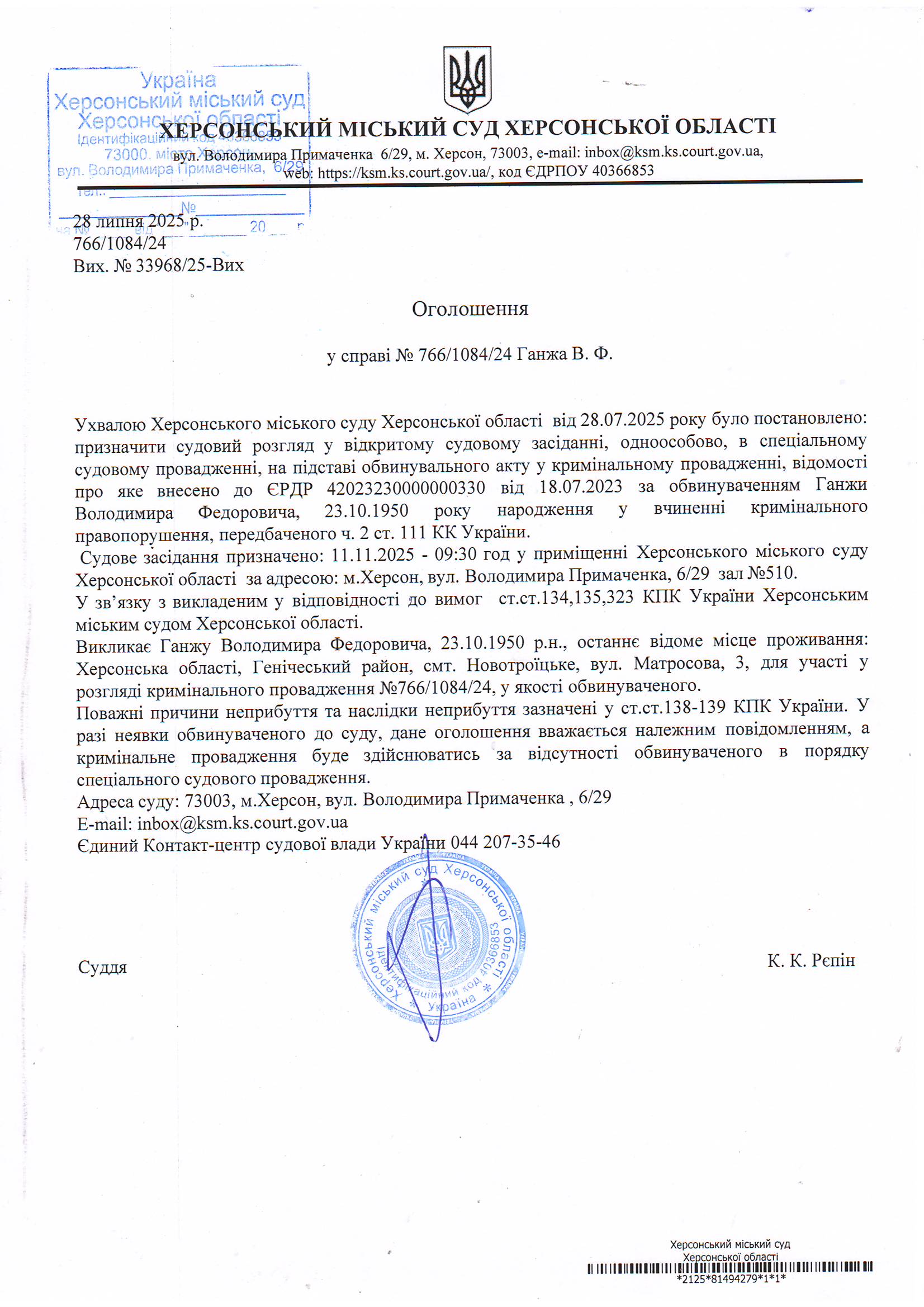 ОГОЛОШЕННЯ ПРО ВИКЛИК ДО СУДУ