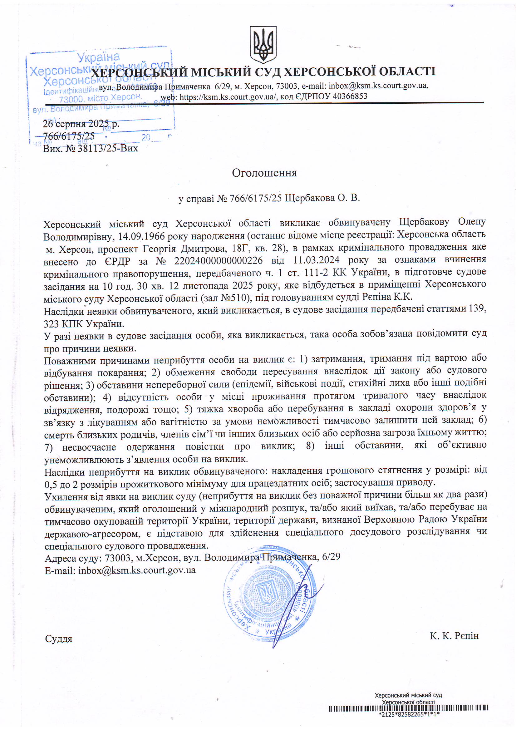 ОГОЛОШЕННЯ ПРО ВИКЛИК ДО СУДУ