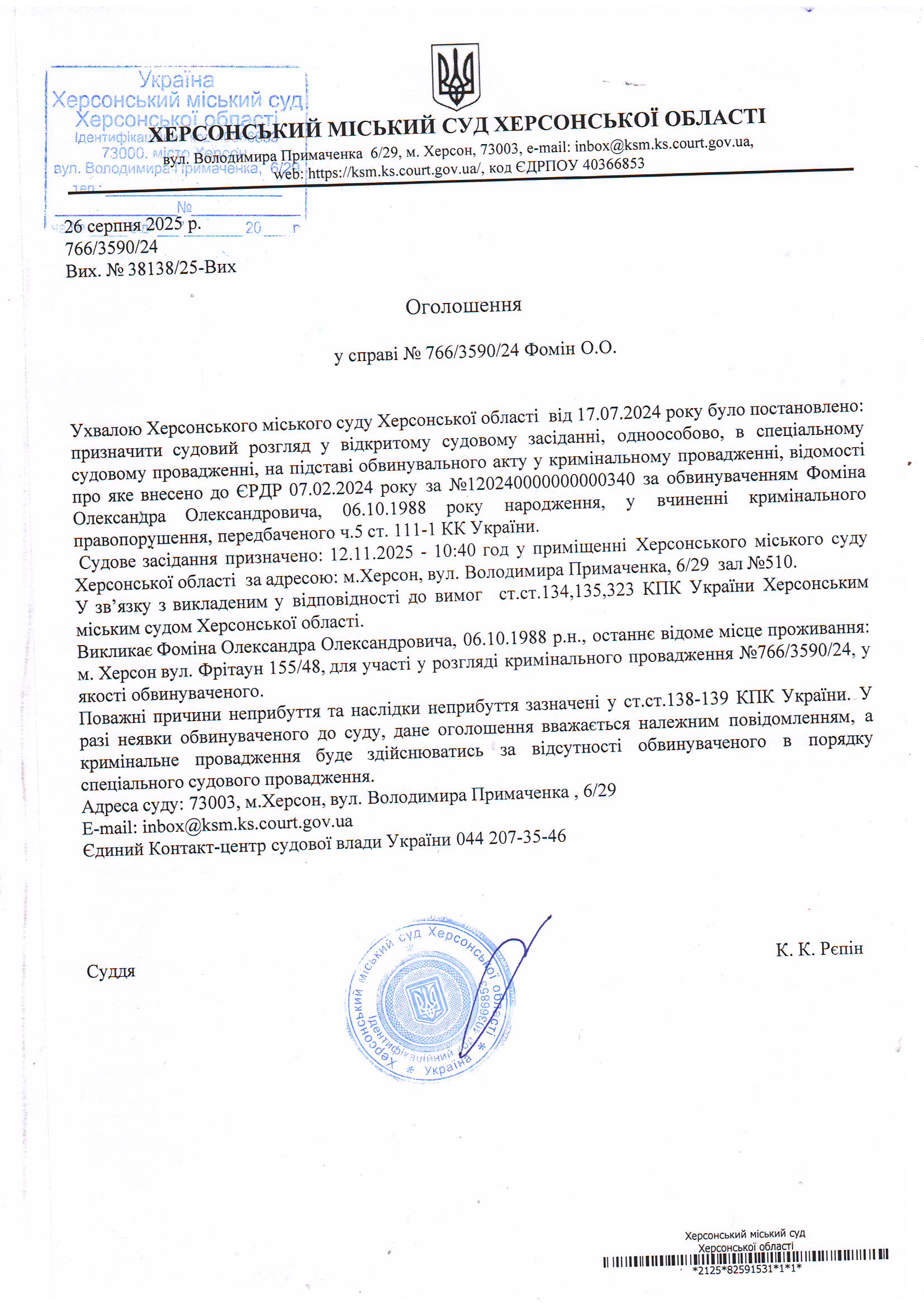 Оголошення для Фоміна Олександра Олександровича