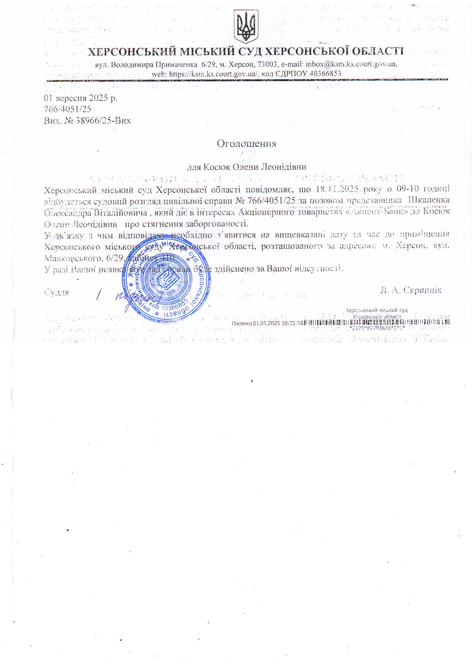 ОГОЛОШЕННЯ ПРО ВИКЛИК ДО СУДУ