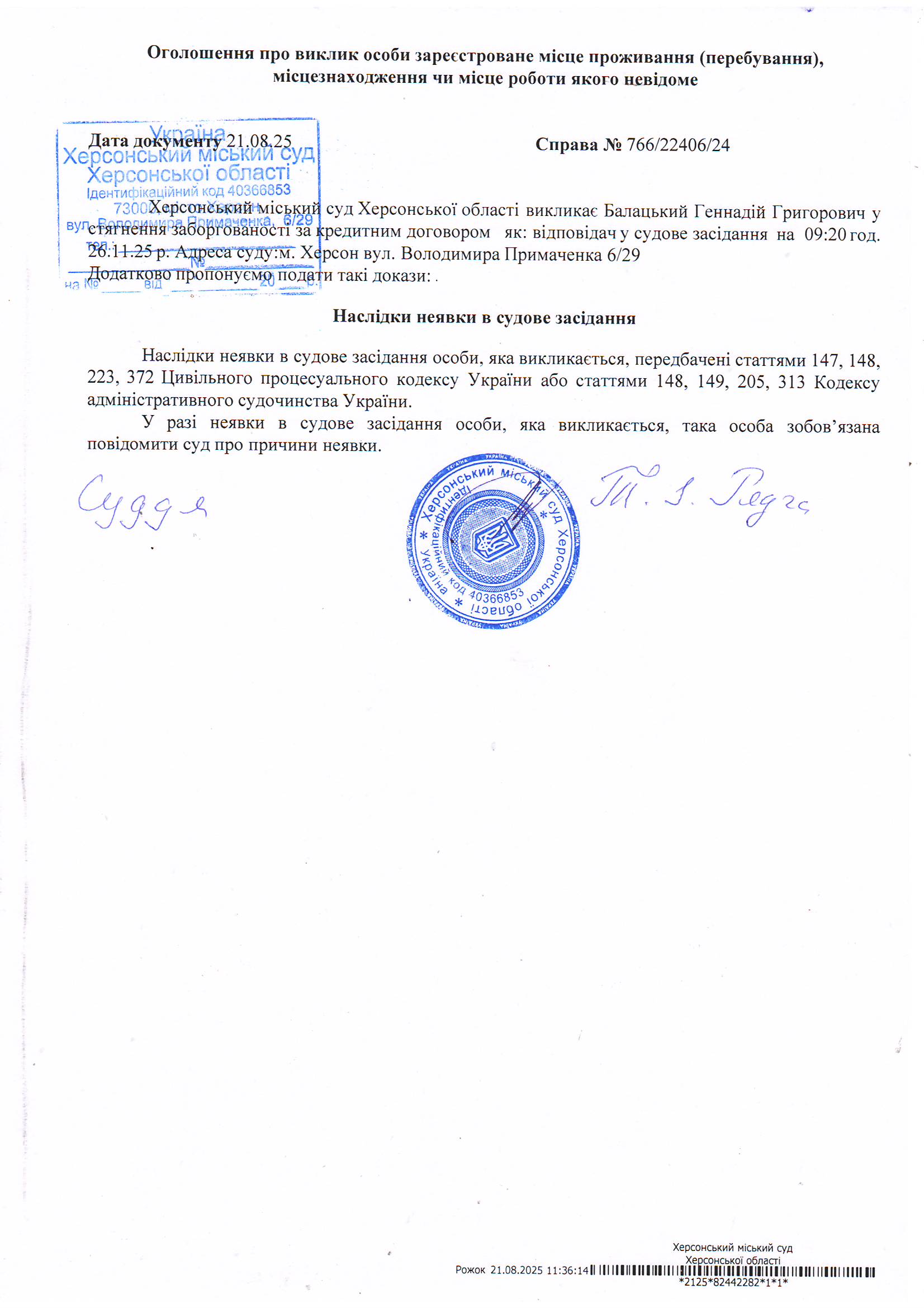 Оголошення про виклик особи в суд та повідомлення про судове рішення