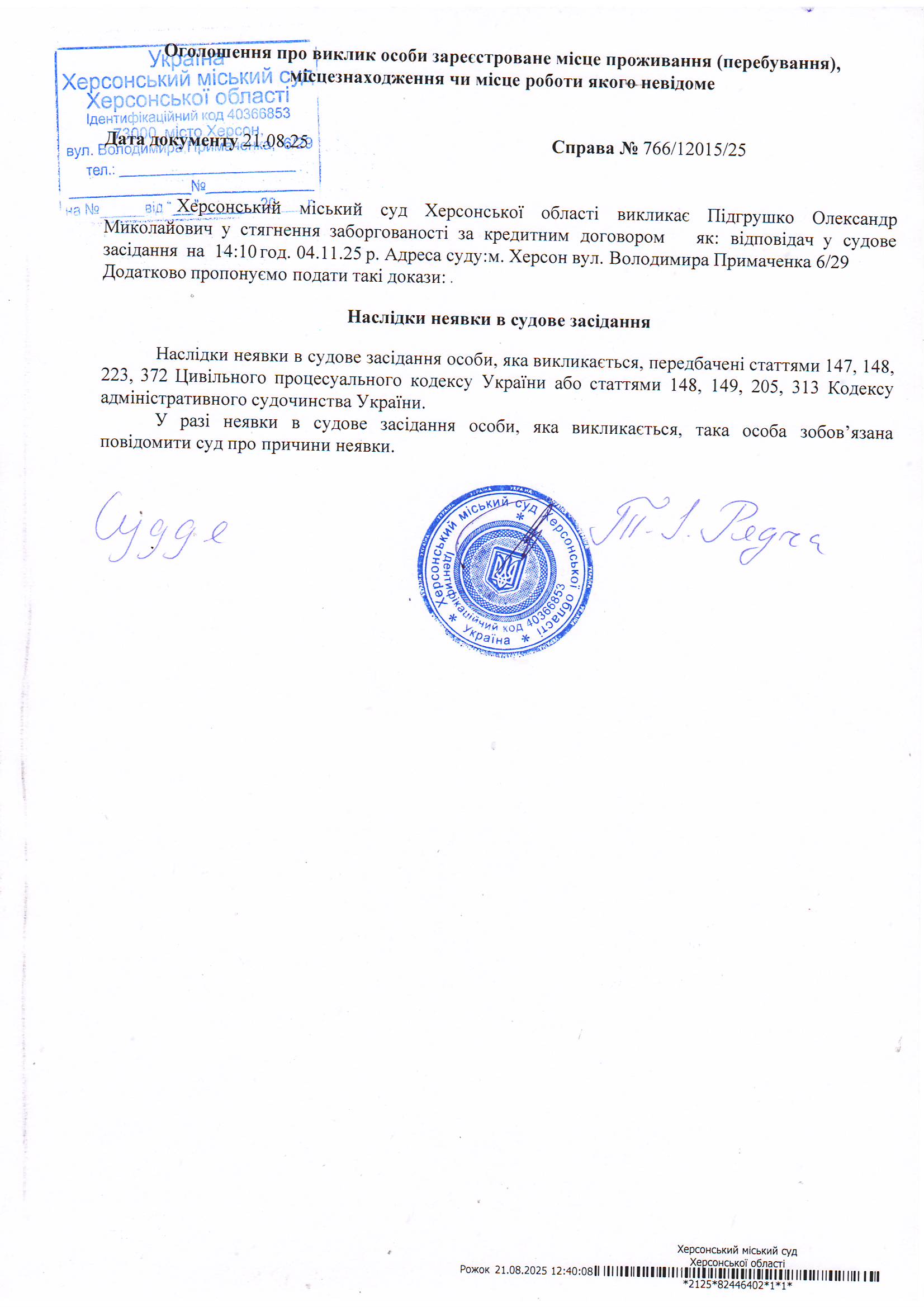 ОГОЛОШЕННЯ ПРО ВИКЛИК ДО СУДУ