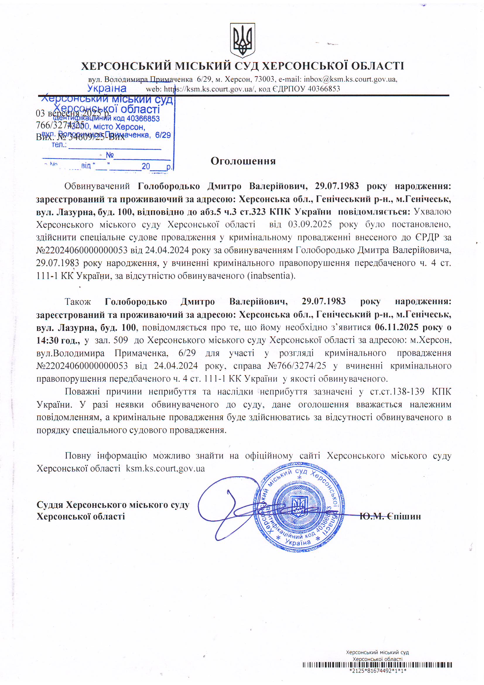 Оголошення для Голобородька Дмитра Валерійовича