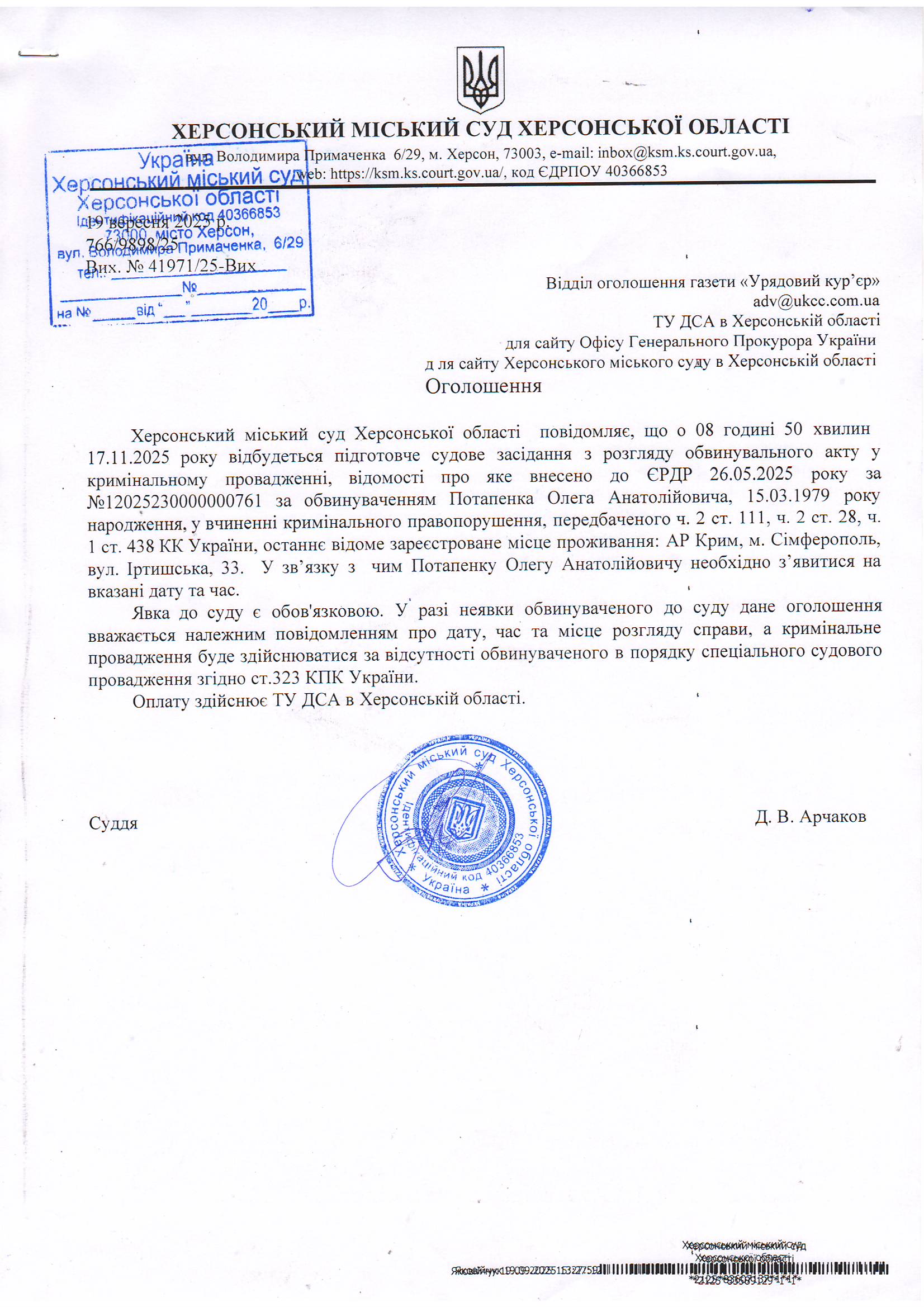 Оголошення для Потапенка Олега Анатолійовича