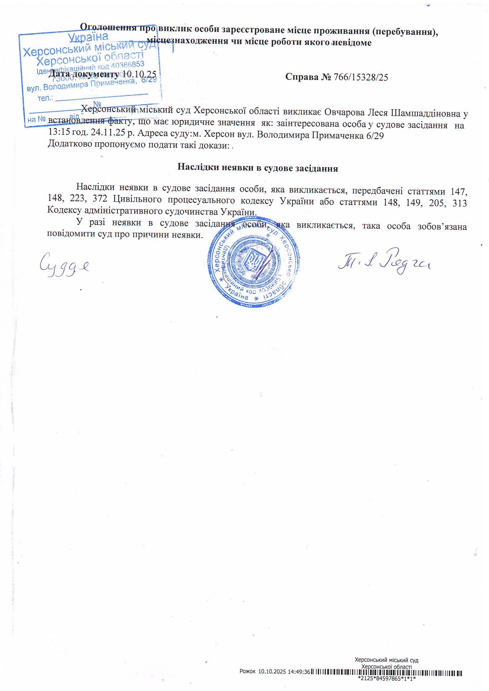 Оголошення для Овчарової Лесі Шамшаддіновни