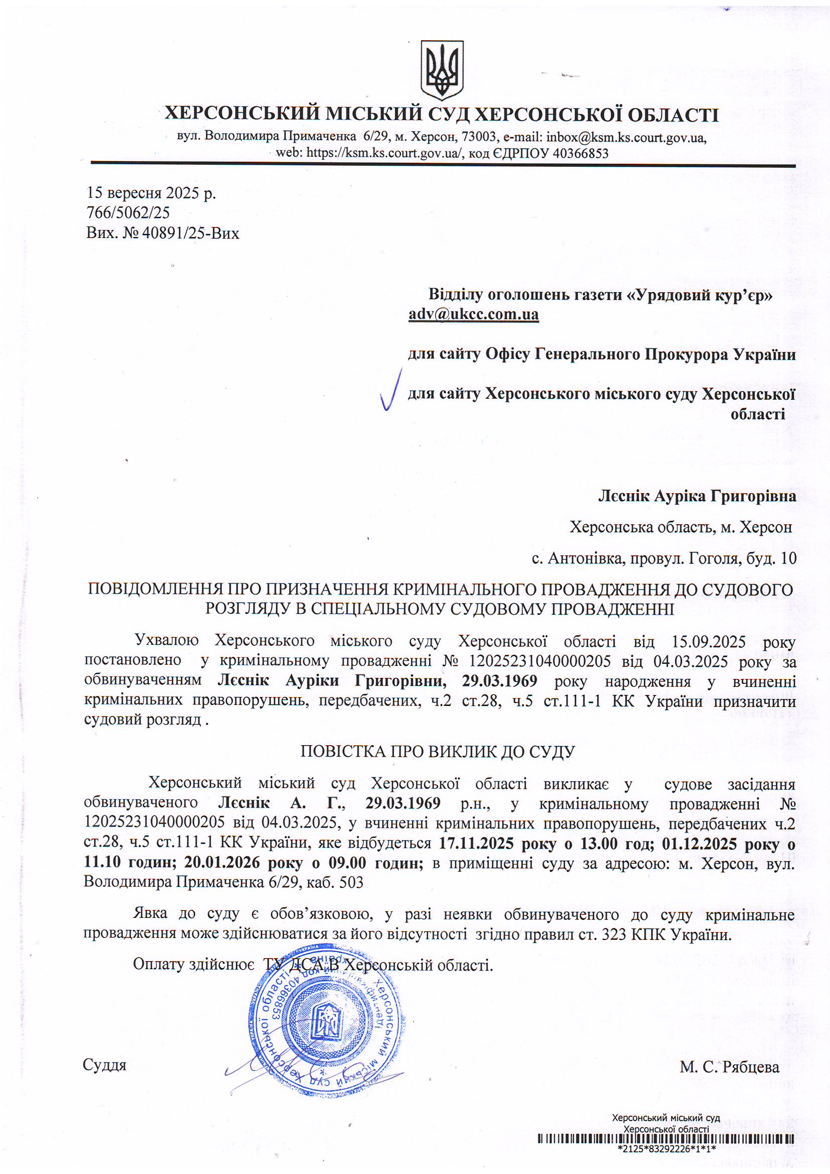 Оголошення для Лєснік Ауріки Григорівни