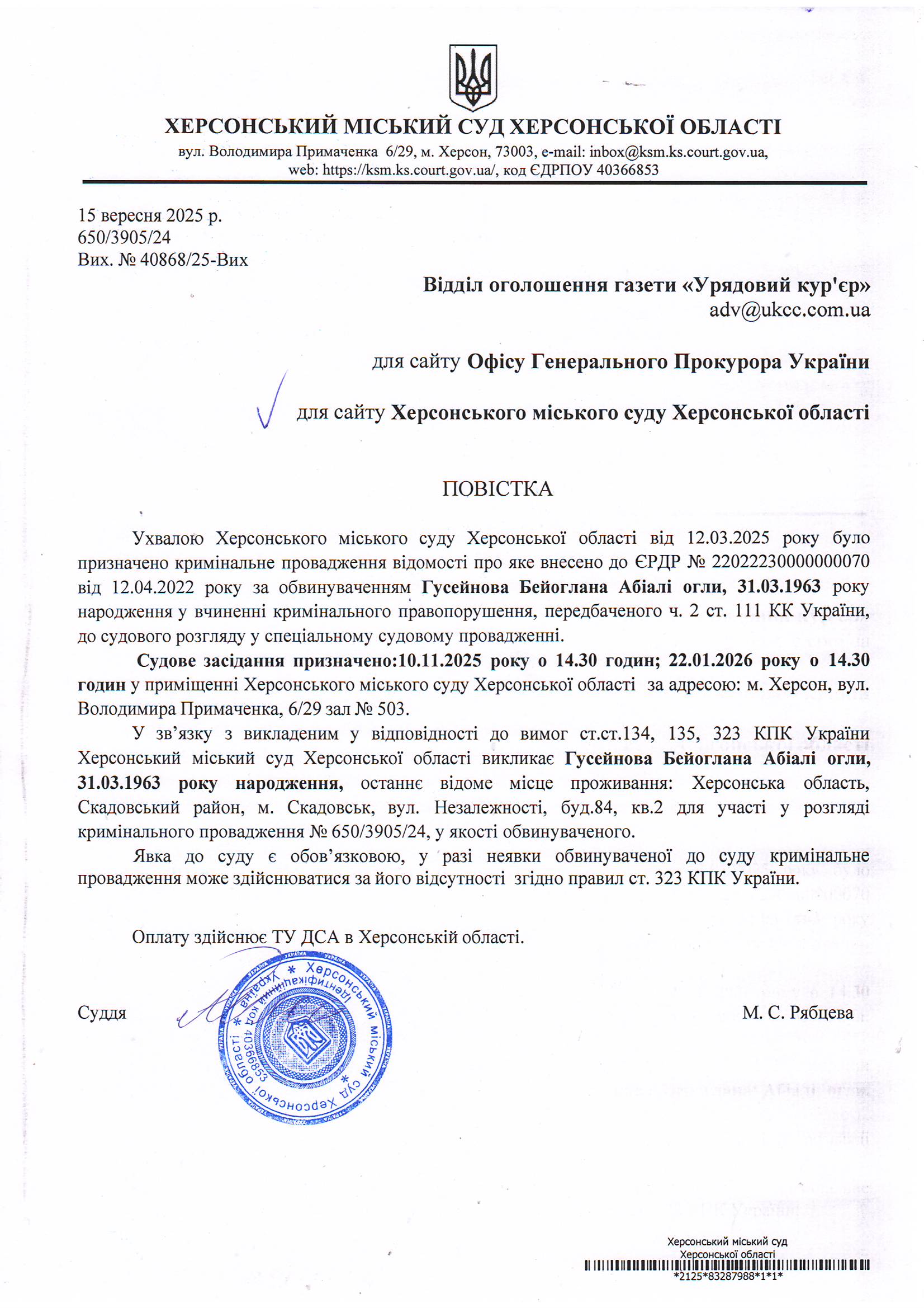 Оголошення для Гусейнова Бейоглана Абіялі огли