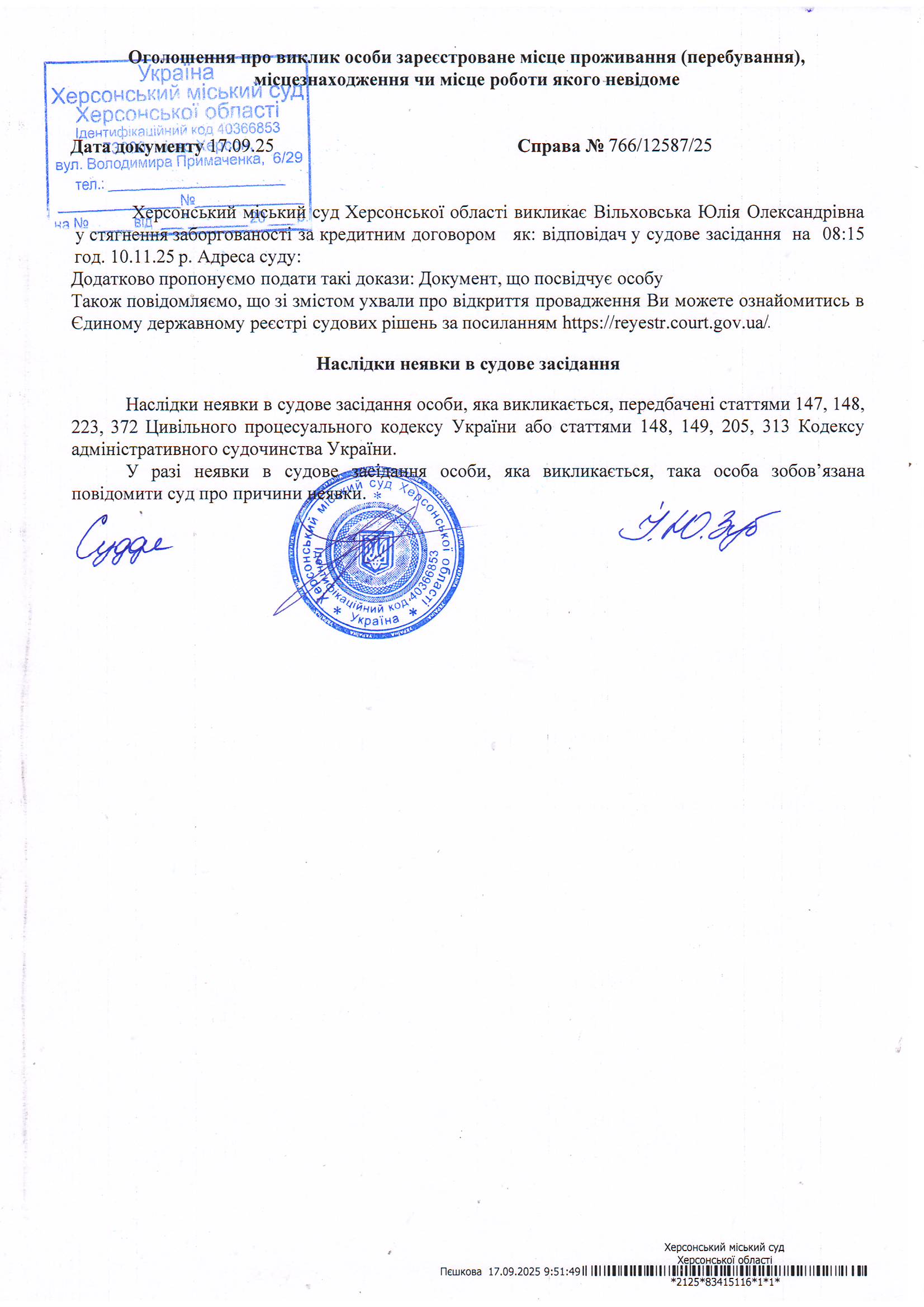 Оголошення для Вільховської Юлії Олександрівни