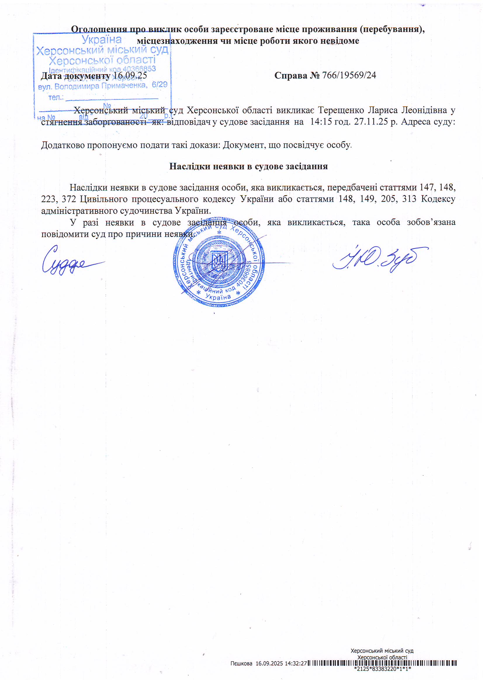 Оголошення для Терещенко Лариси Леонідівни