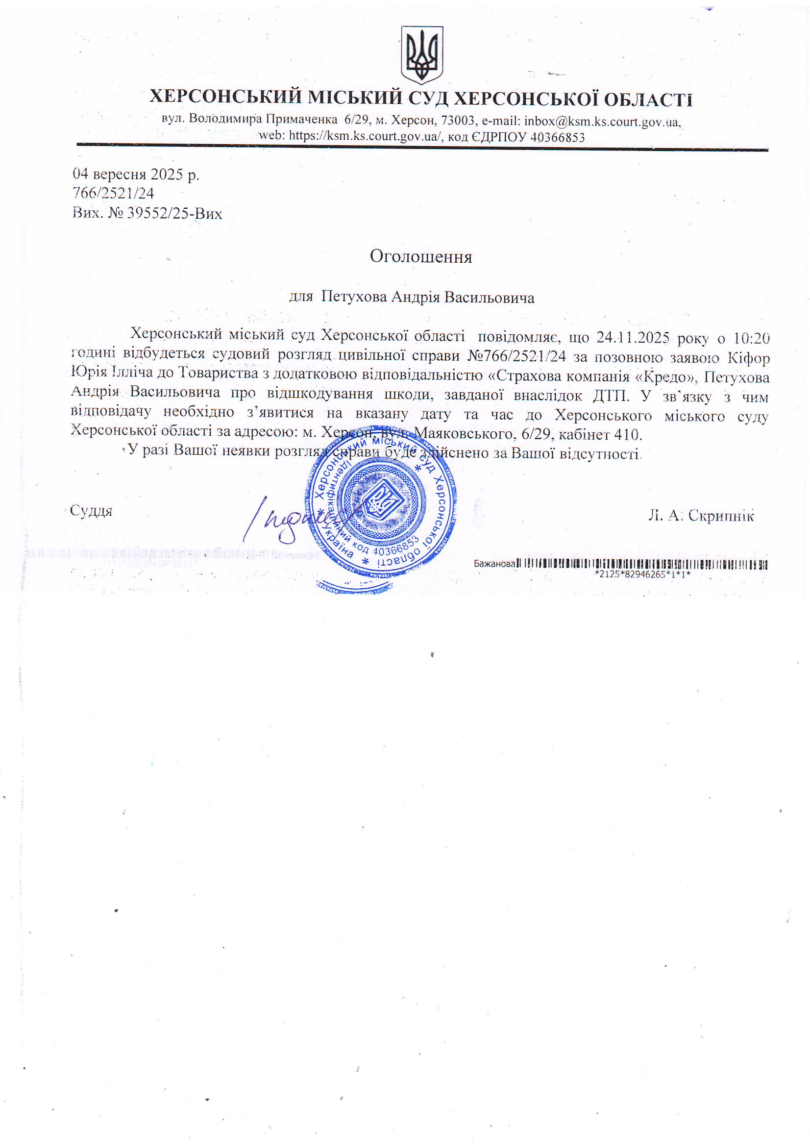 Оголошення для Петухова Андрія Васильовича