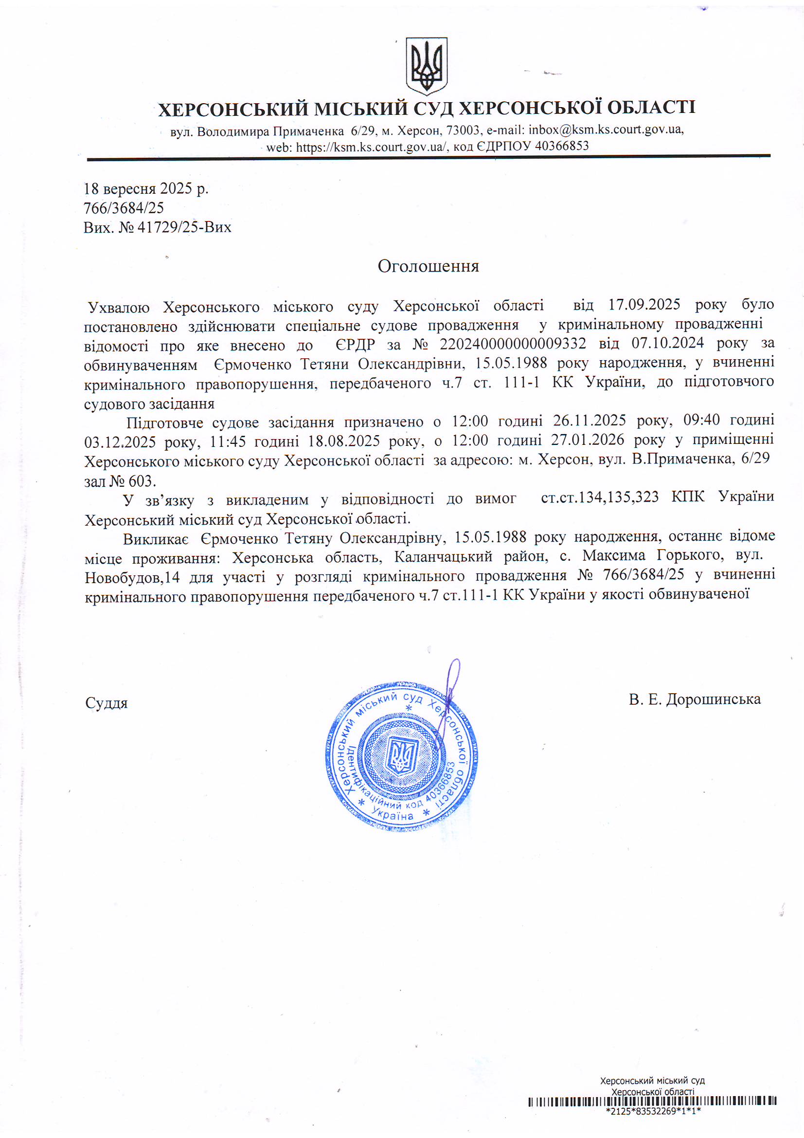 Оголошення для Єрмоченко Тетяни Олександрівни