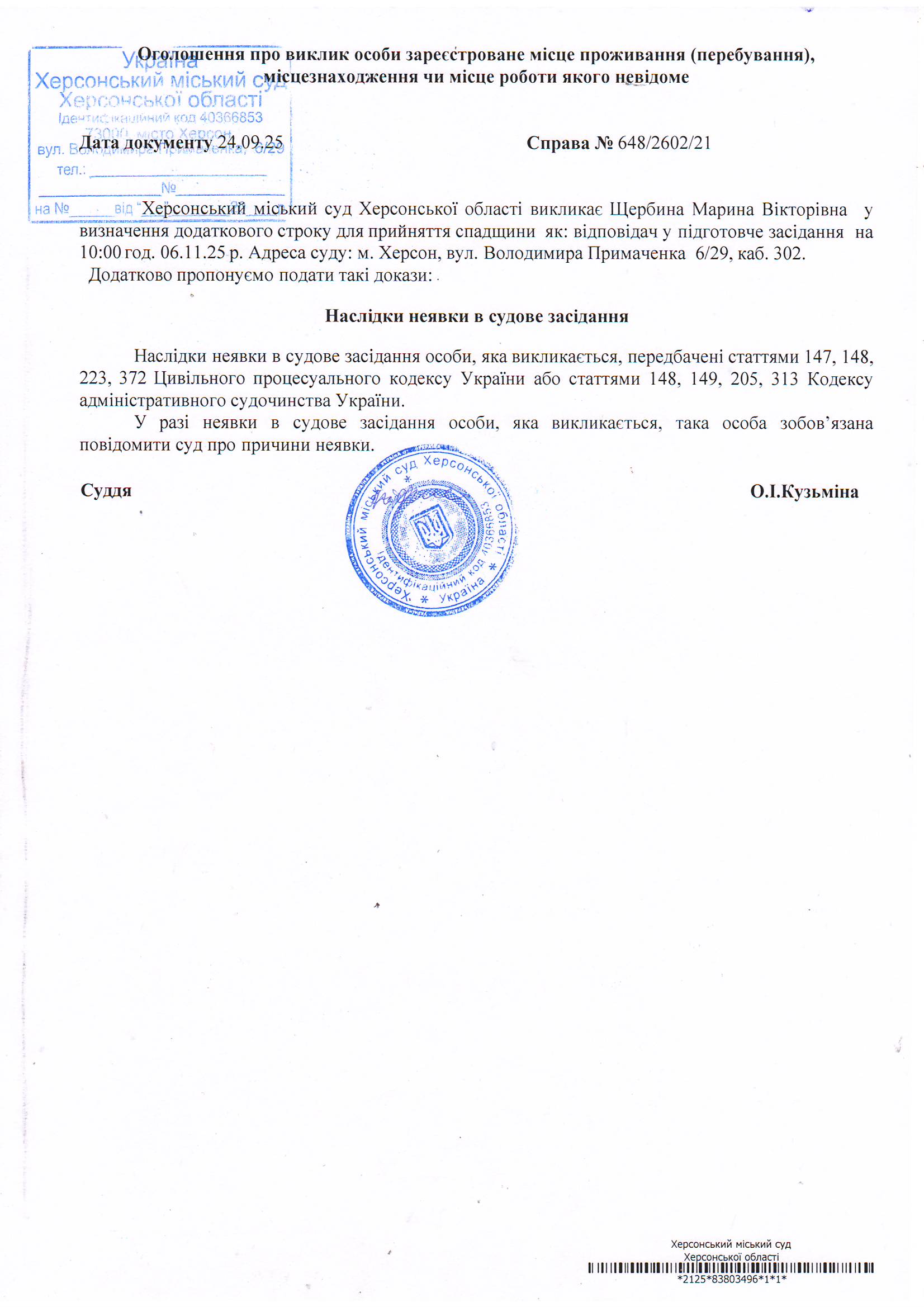 Оголошення для Щербини Марини Вікторівни