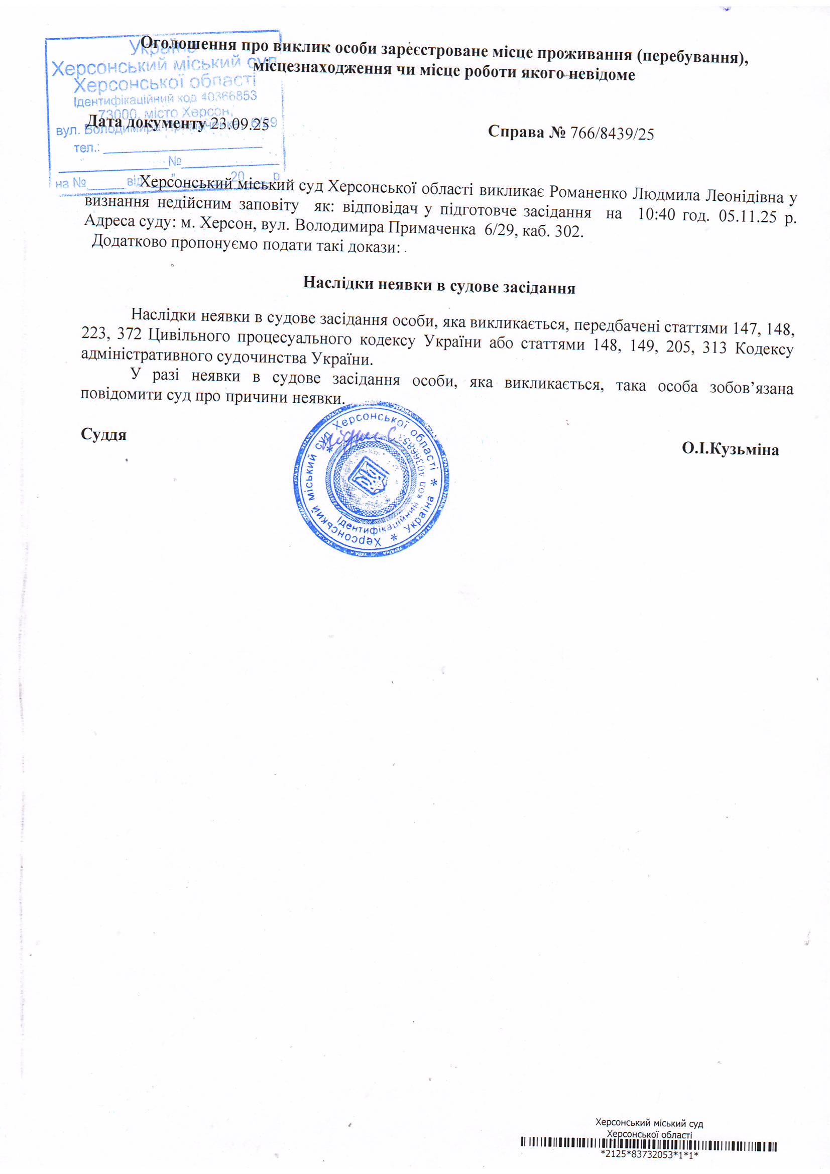 Оголошення для Романенко Людмили Леонідівни