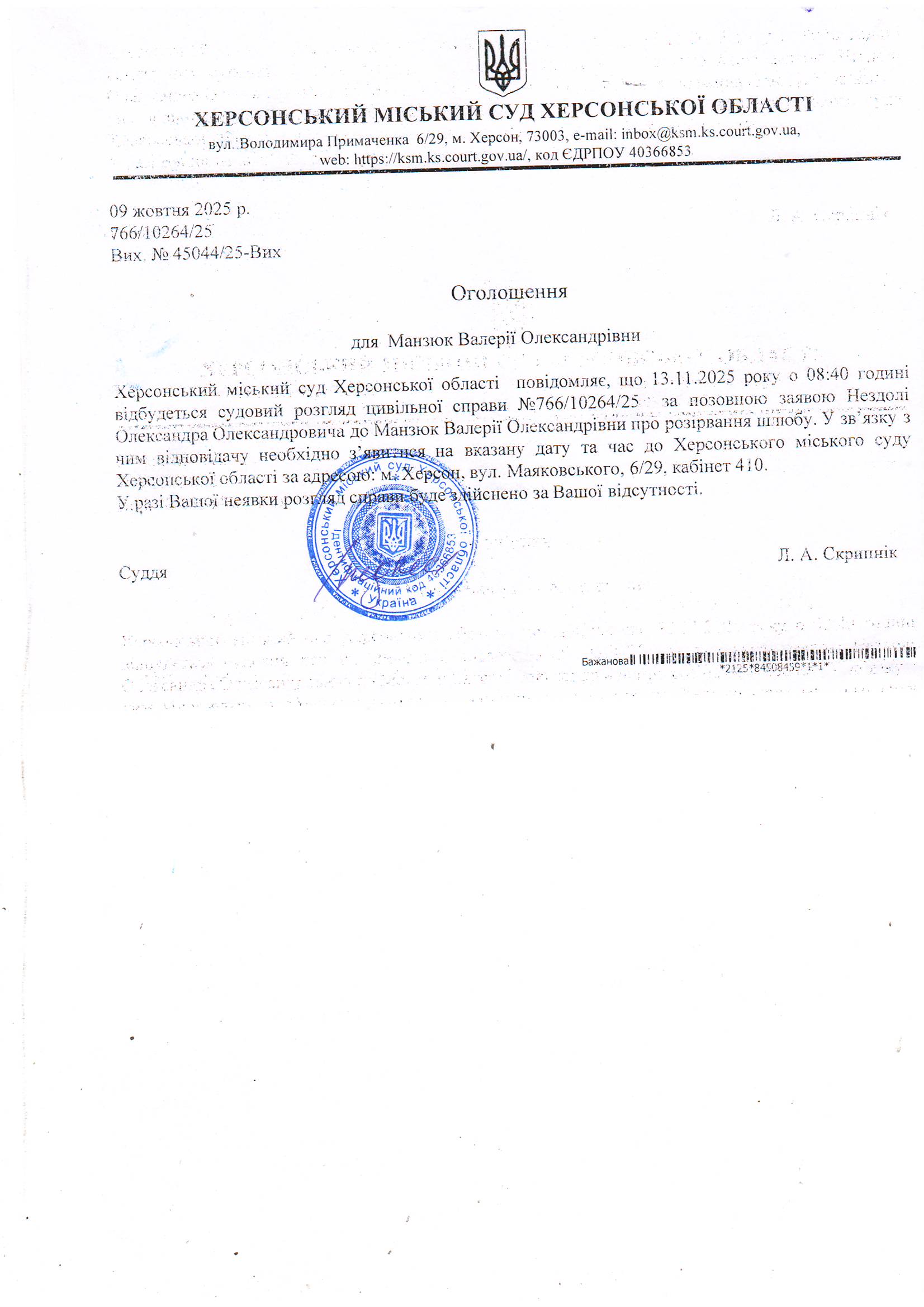 Оголошення для Манзюк Валерії Олександрівни