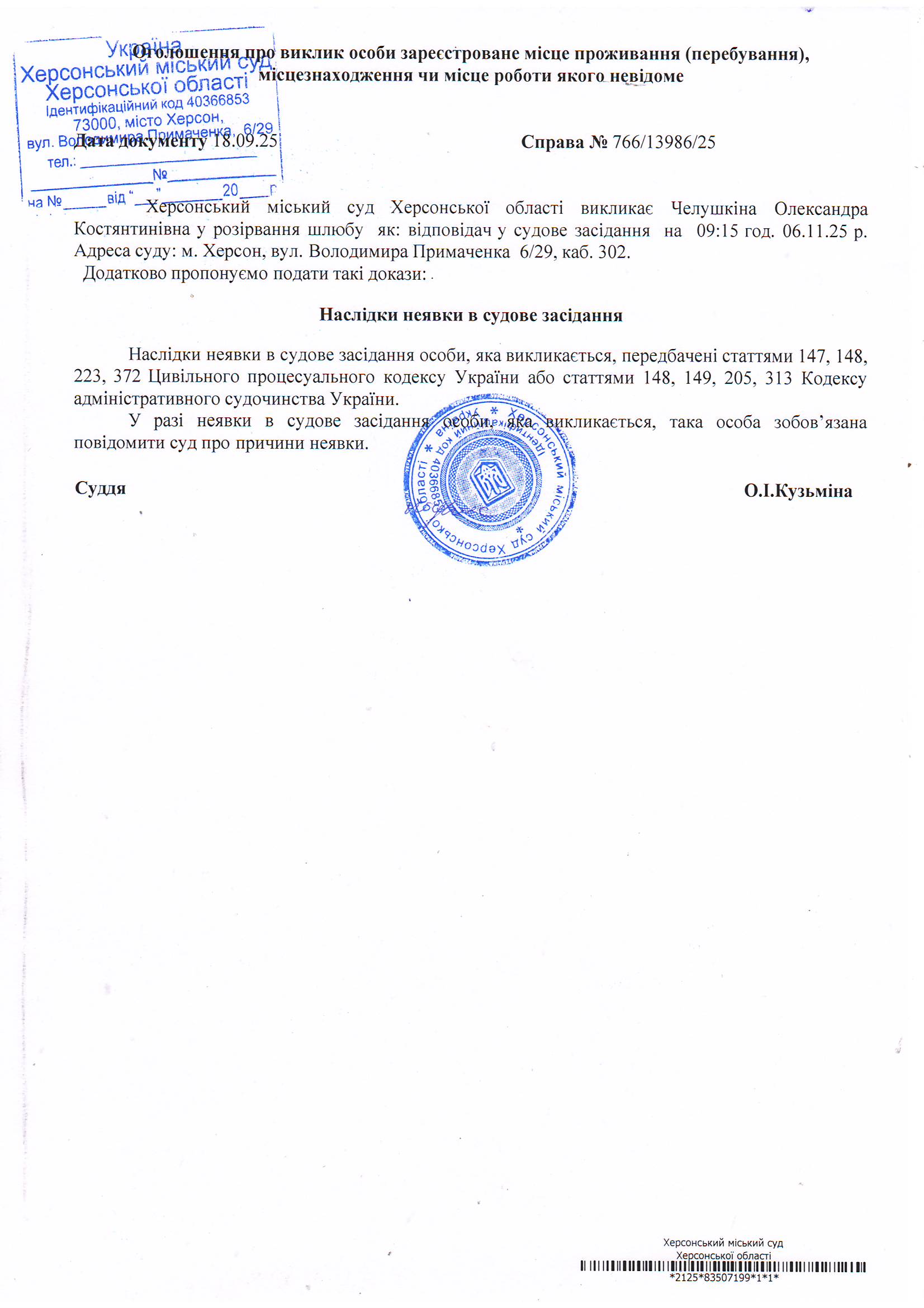 Оголошення для Челушкіної Олександри Костянтинівни