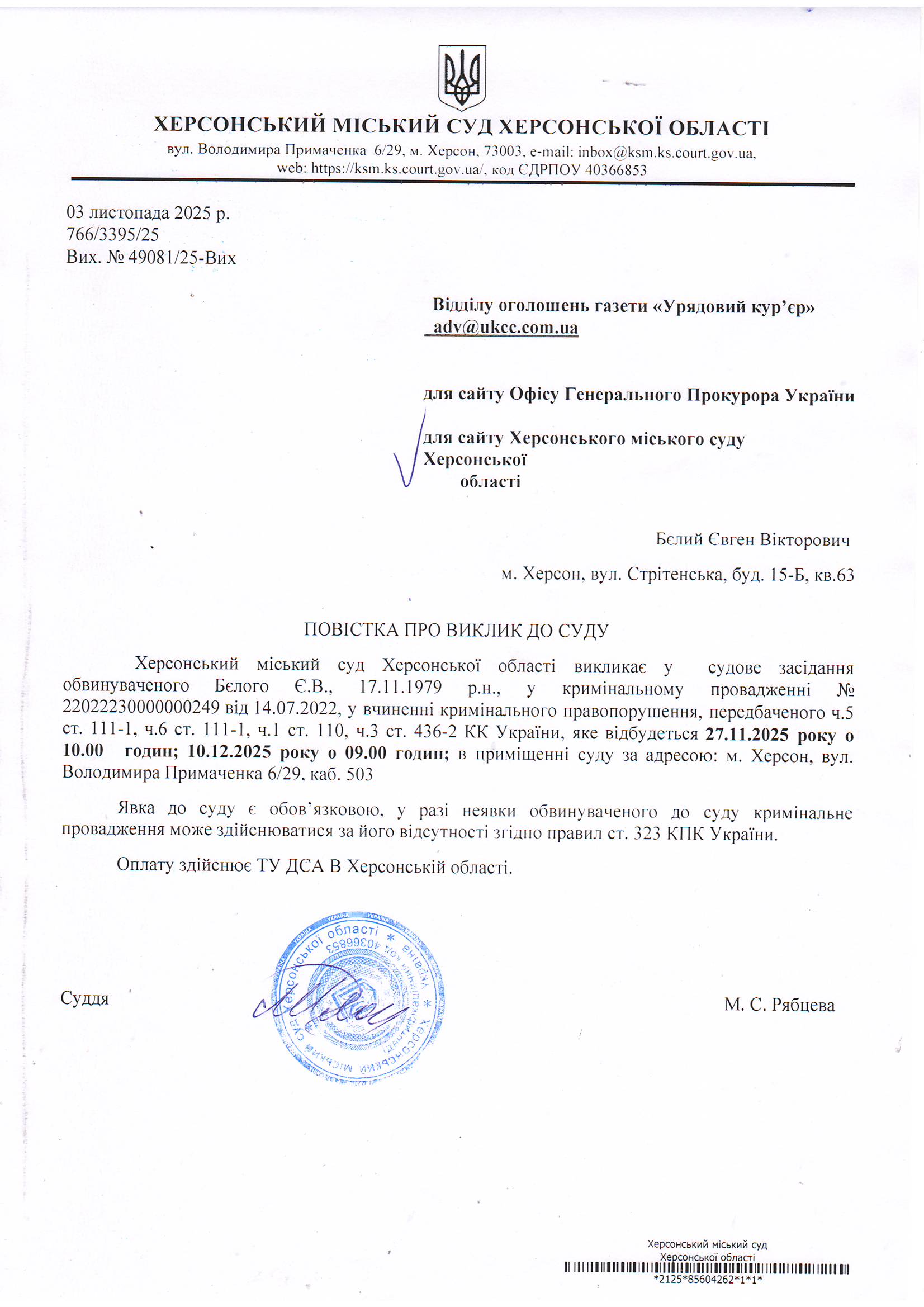 Оголошення для Бєлого Євгена Вікторовича