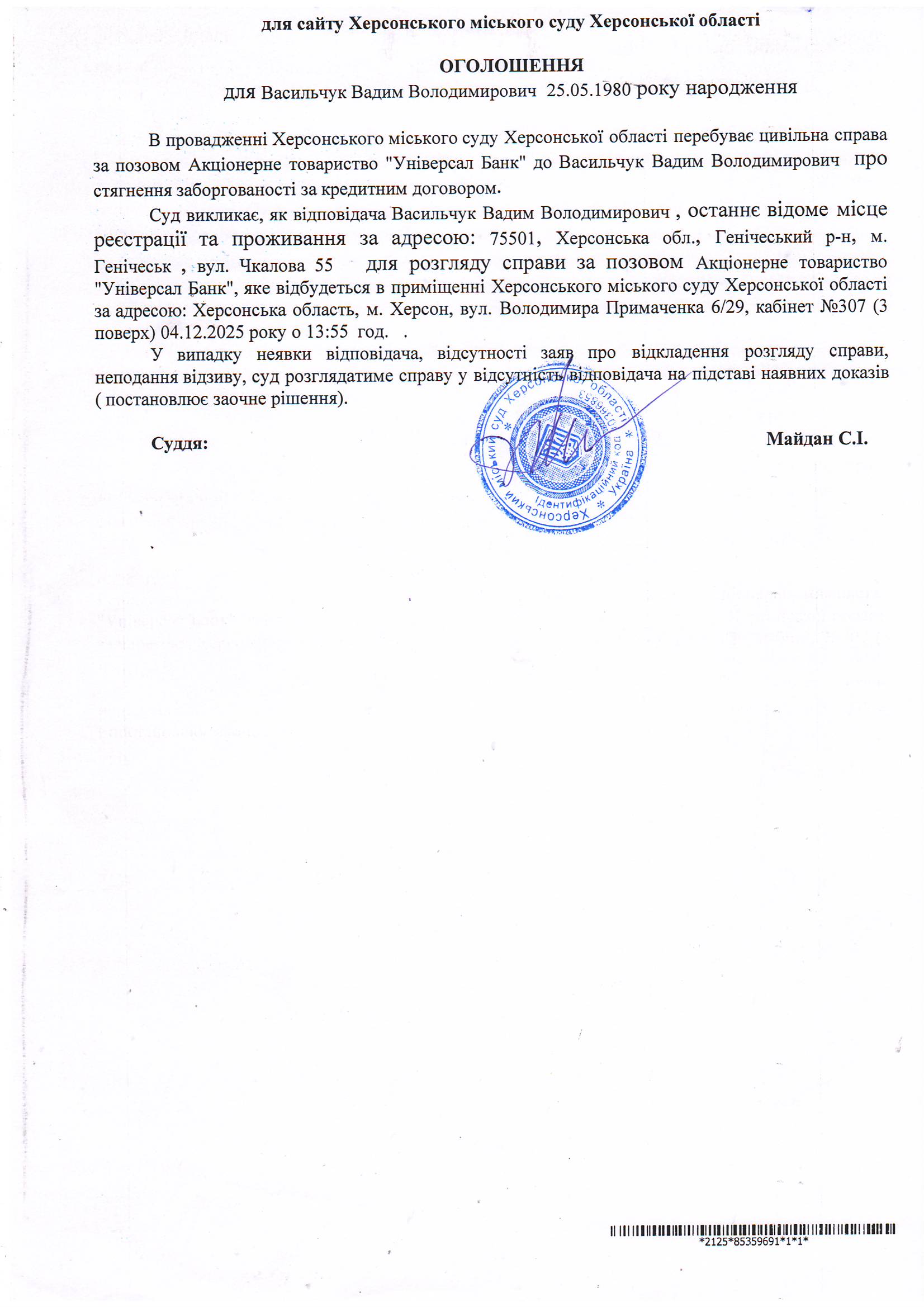 Оголошення для Васильчука Вадима Володимировича