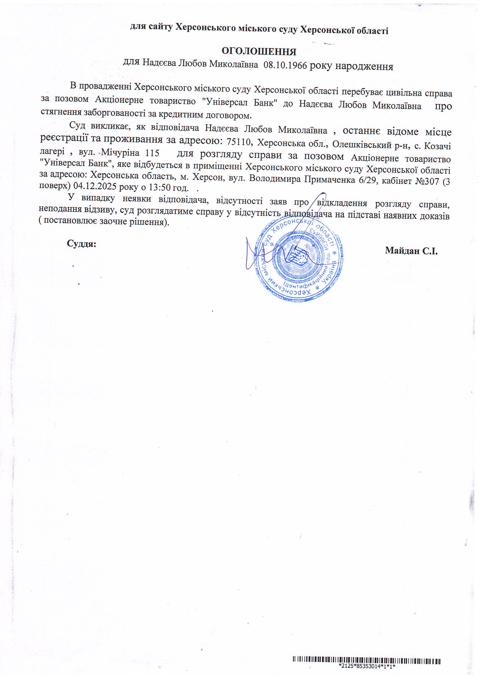 Оголошення для Надєєвої Любові Миколаївни
