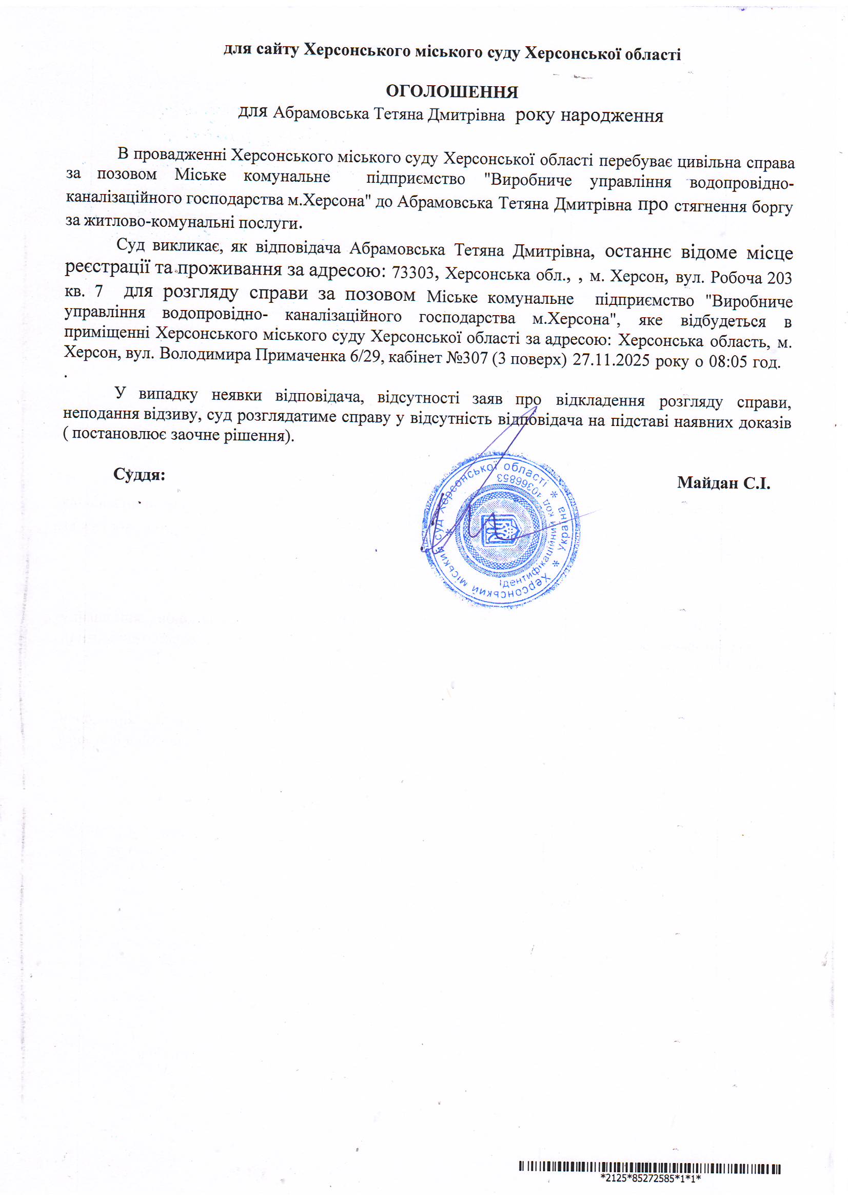 Оголошення для Абрамовської Тетяни Дмитрівни