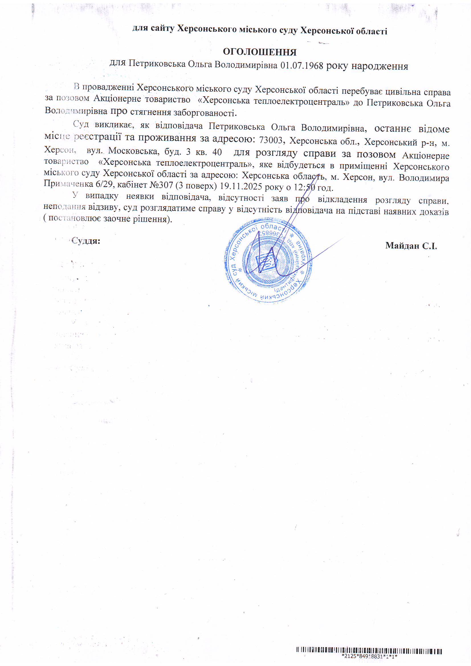 Оголошення для Петриковської Ольги Володимирівни