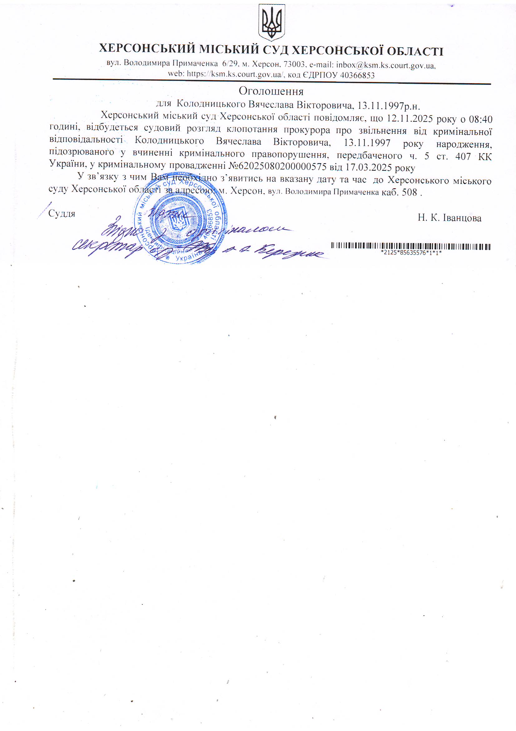 Оголошення для Колодницького Вячеслава Вікторовича