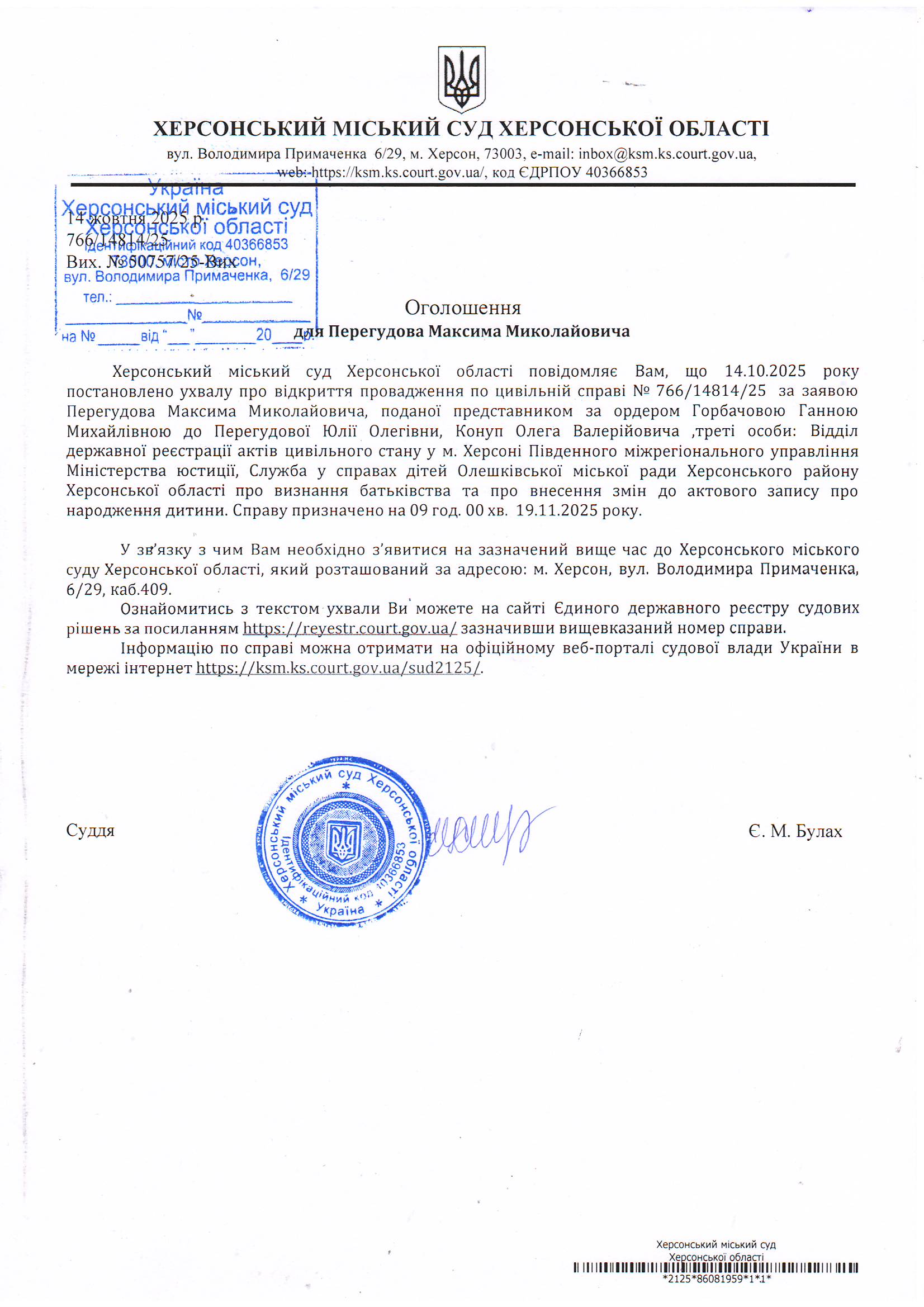 Оголошення про виклик особи в суд та повідомлення про судове рішення