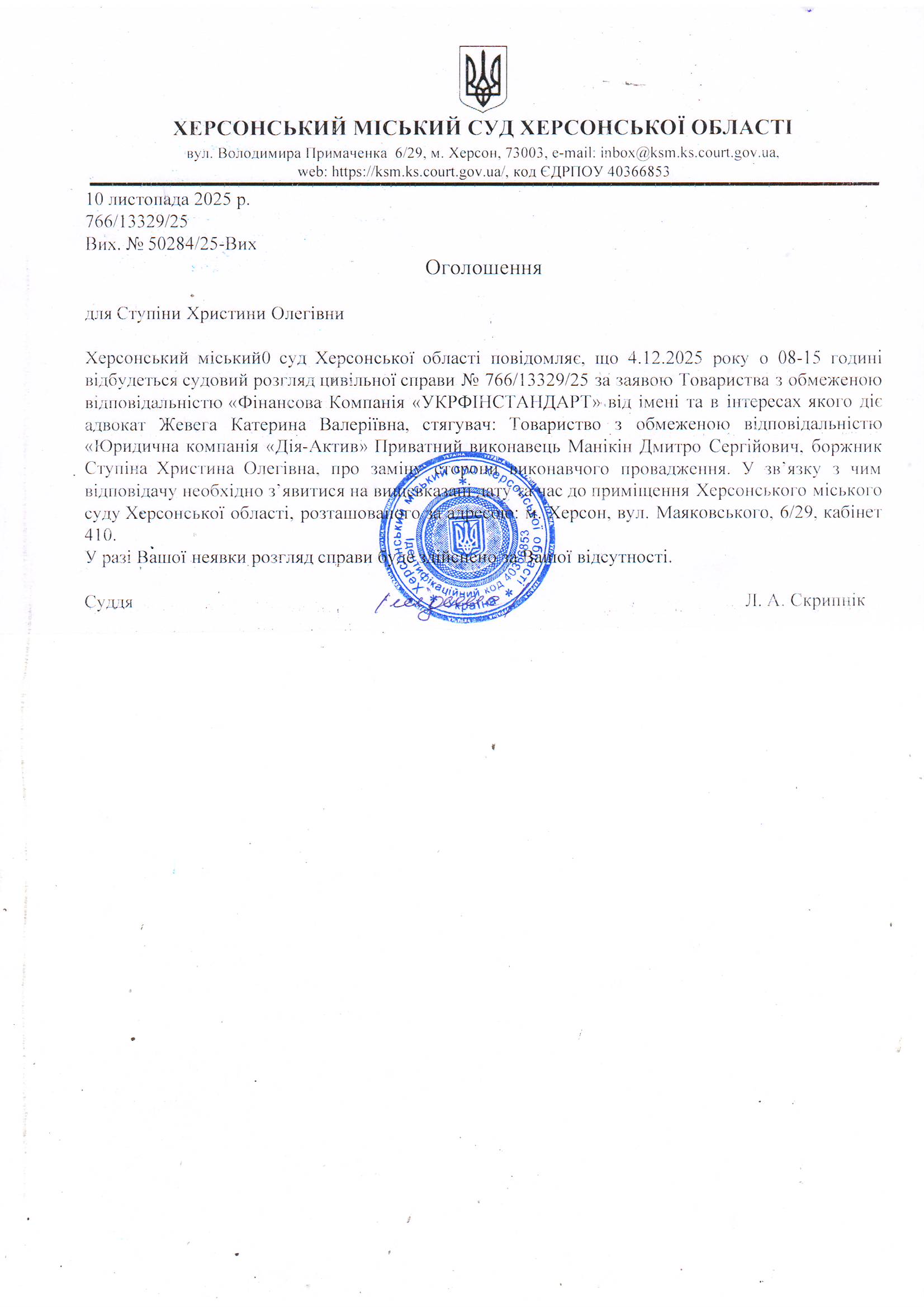Оголошення для Ступіни Христини Олегівни