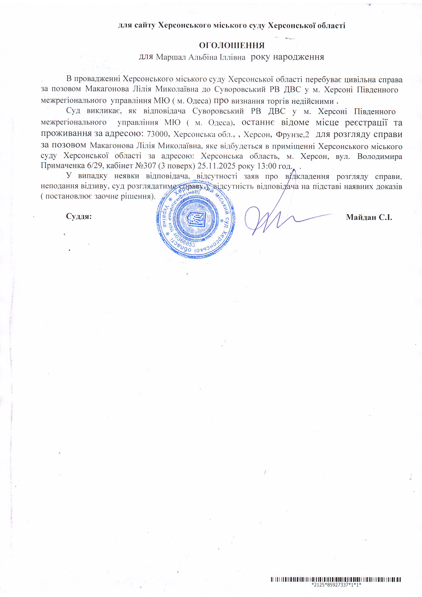 Оголошення для Маршал Альбіни Іллівни
