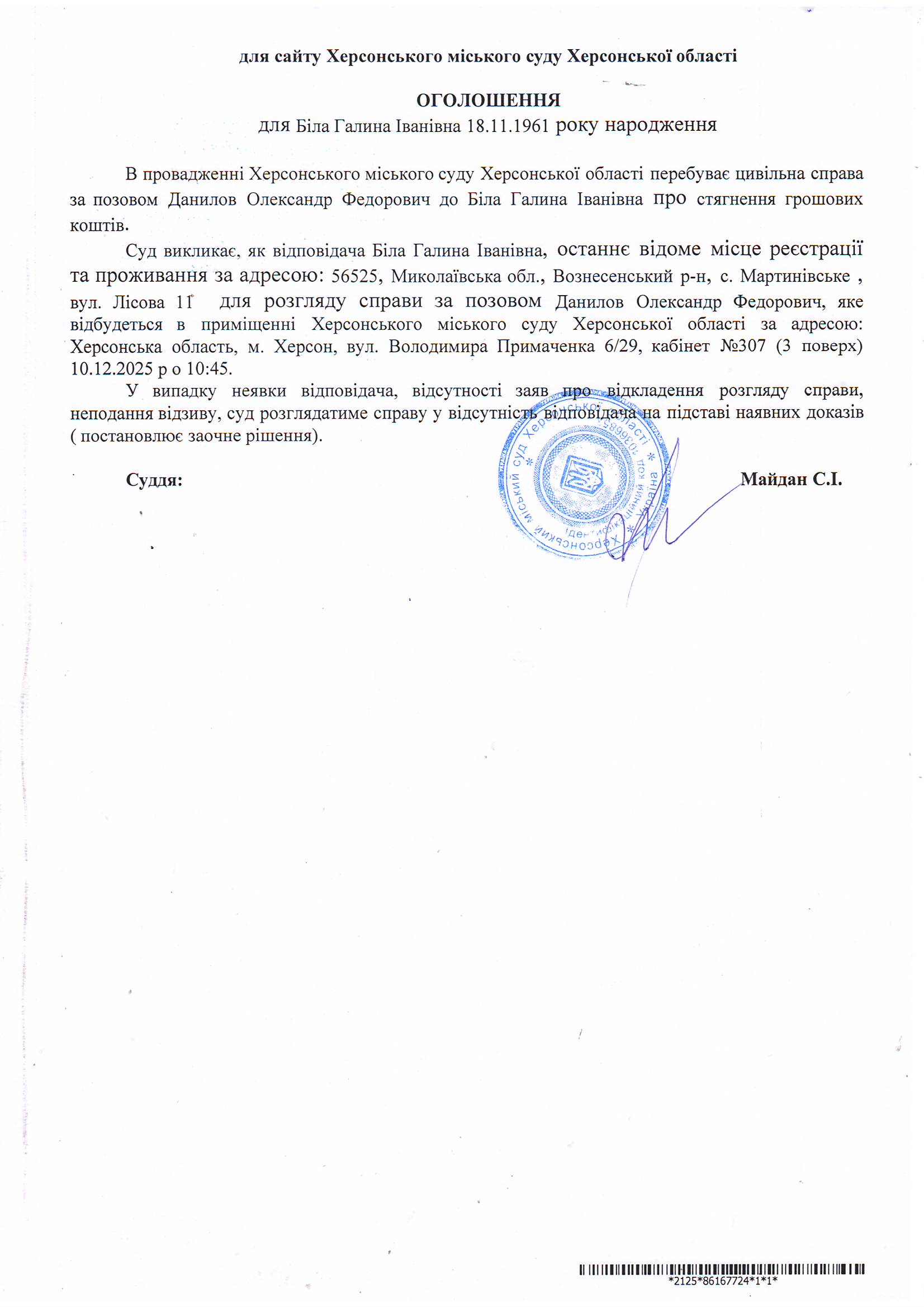 Оголошення для Білої Галини Іванівни