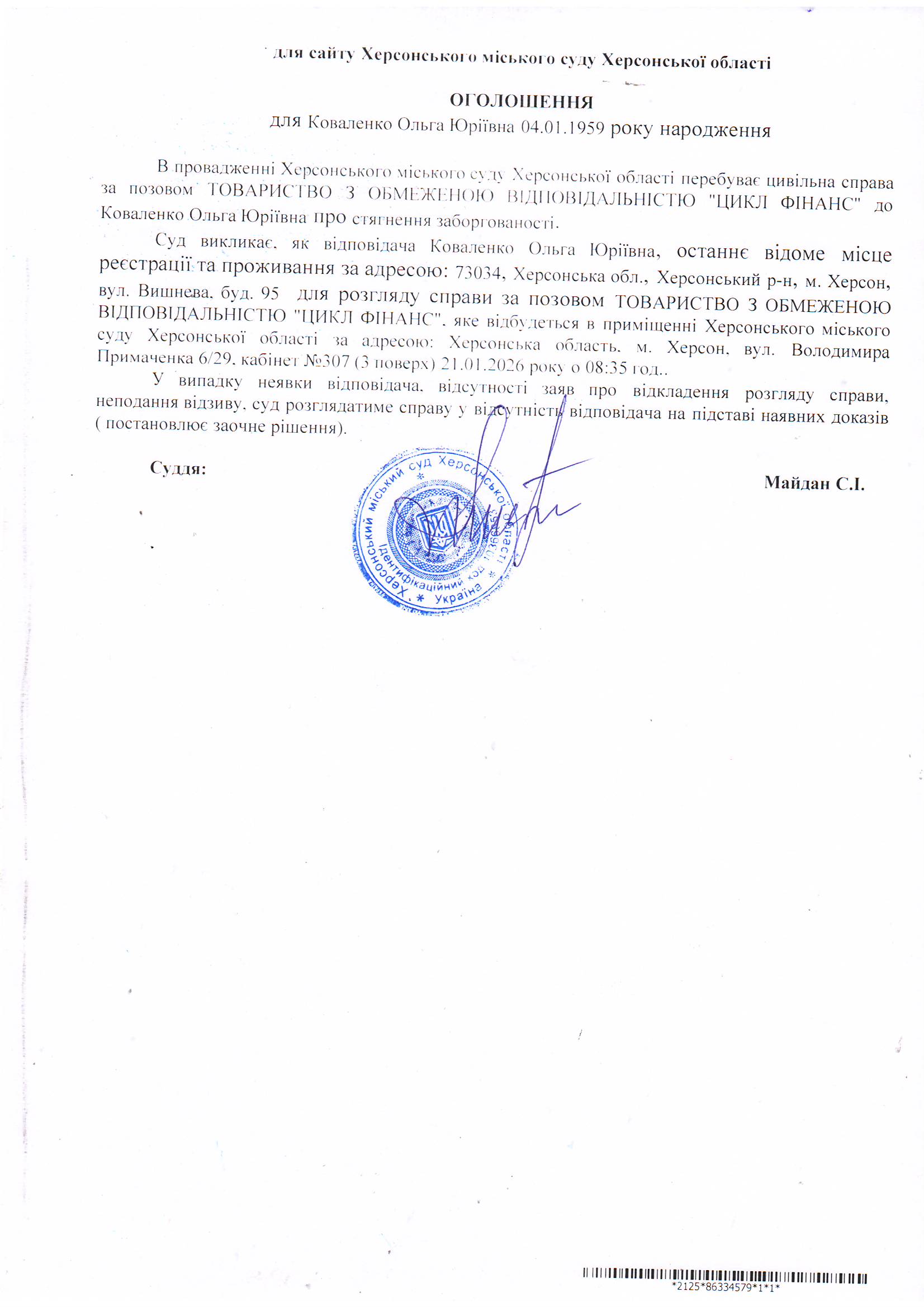 ОГОЛОШЕННЯ ПРО ВИКЛИК ДО СУДУ