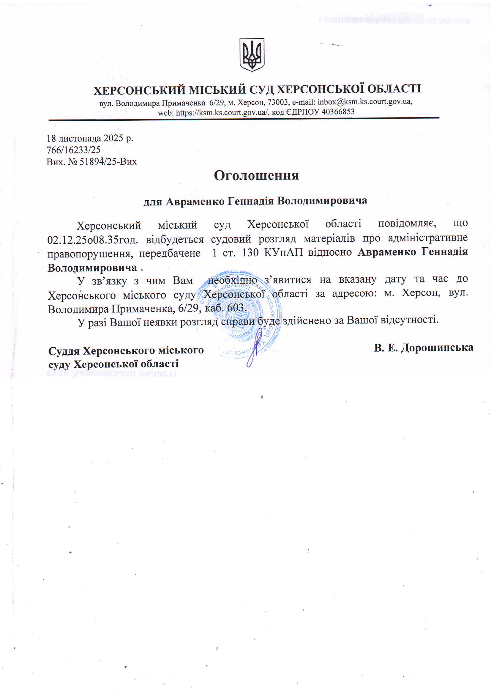 ОГОЛОШЕННЯ ПРО ВИКЛИК ДО СУДУ
