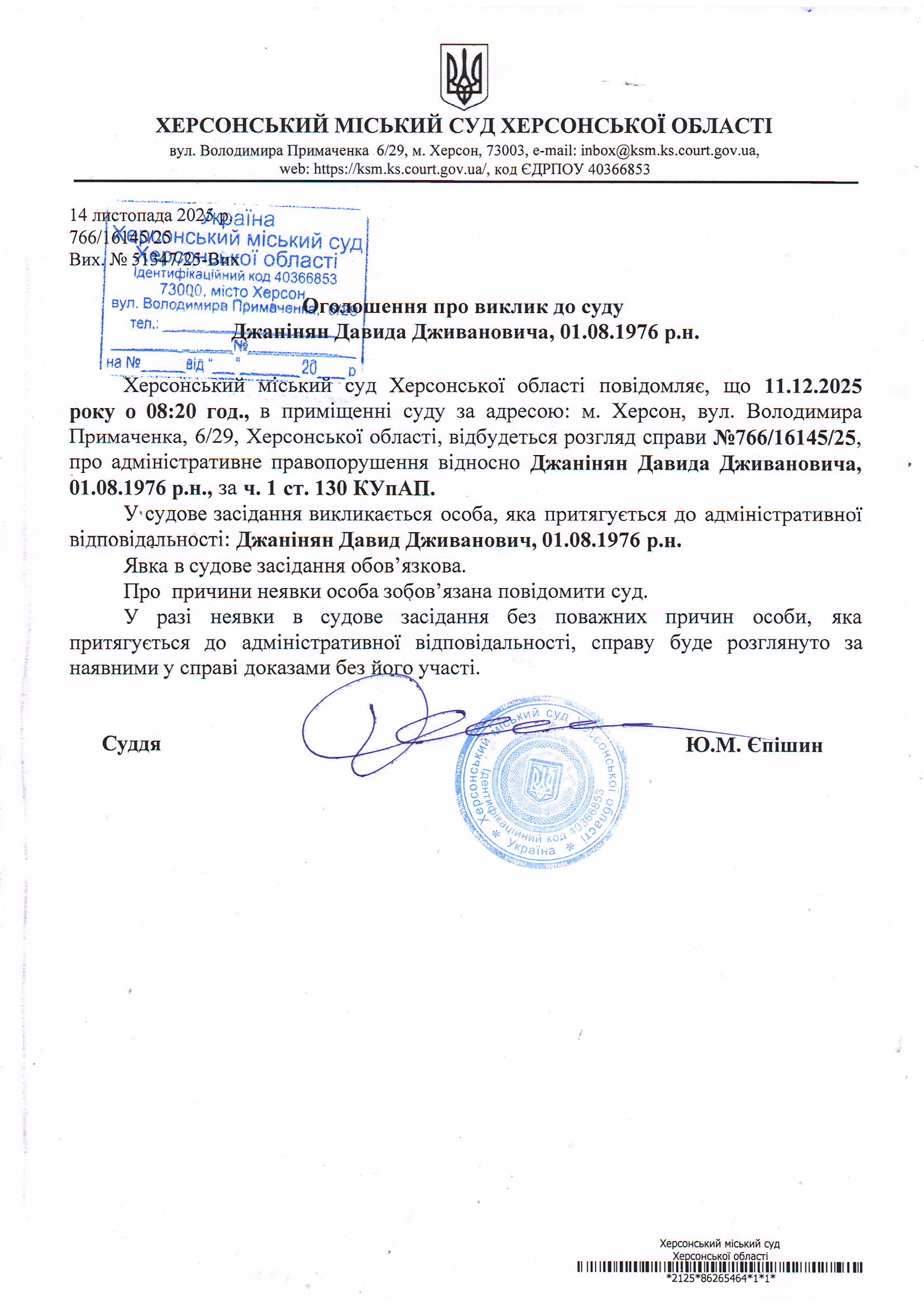 ОГОЛОШЕННЯ ПРО ВИКЛИК ДО СУДУ