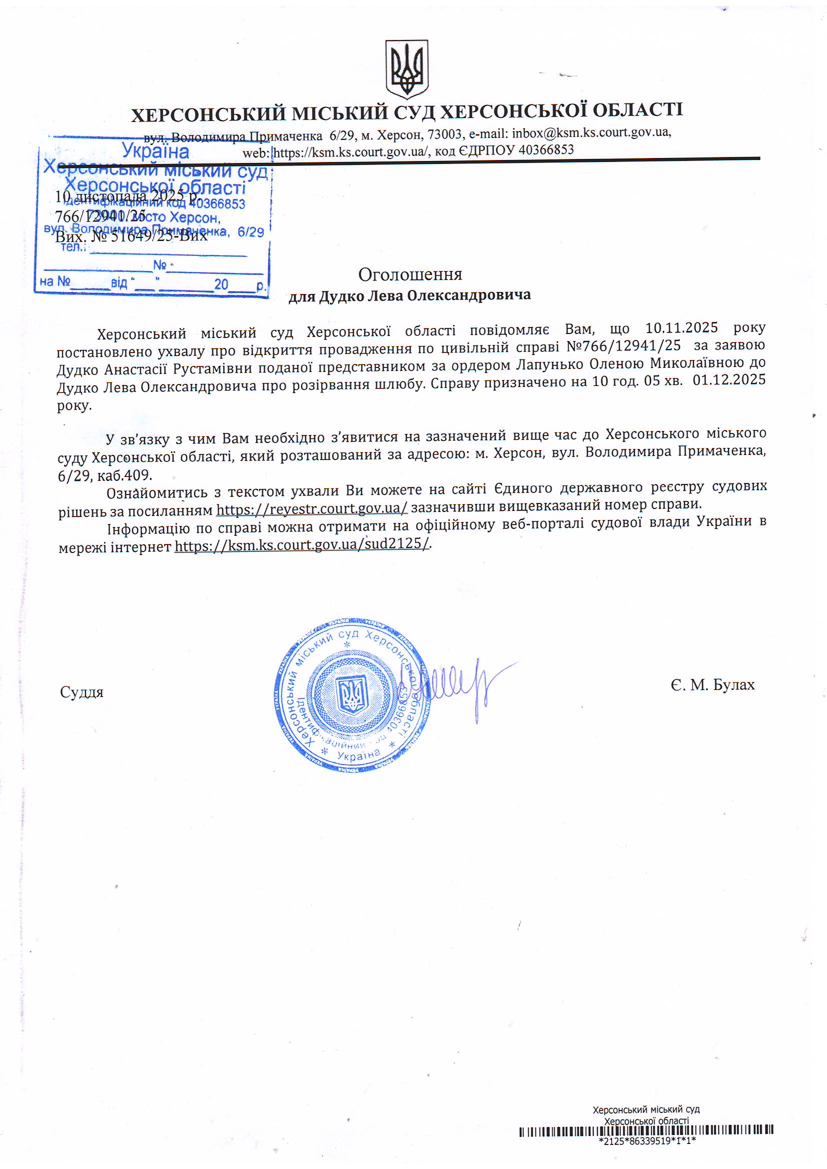 ОГОЛОШЕННЯ ПРО ВИКЛИК ДО СУДУ