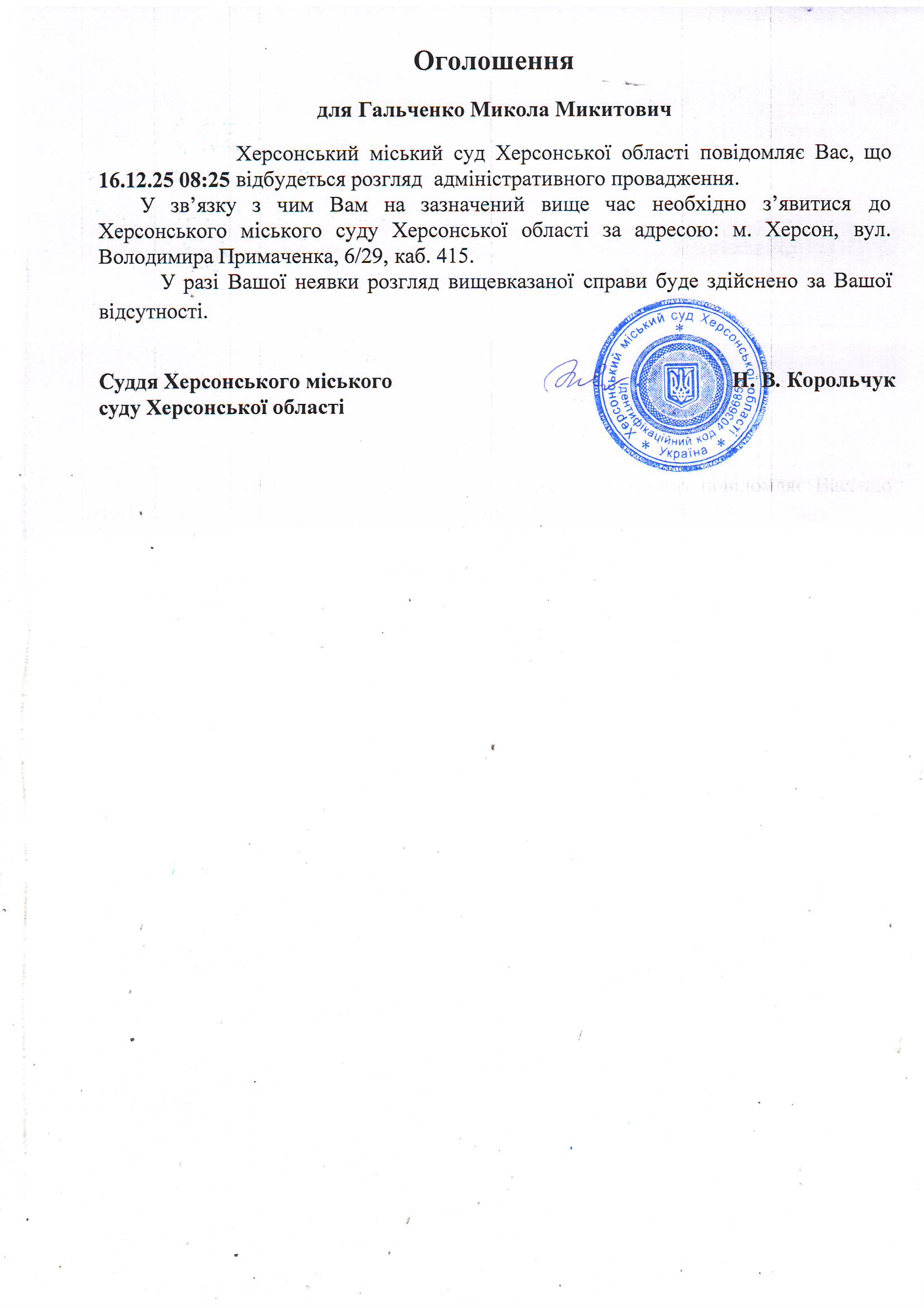 Оголошення для Гальченка Миколи Микитовича
