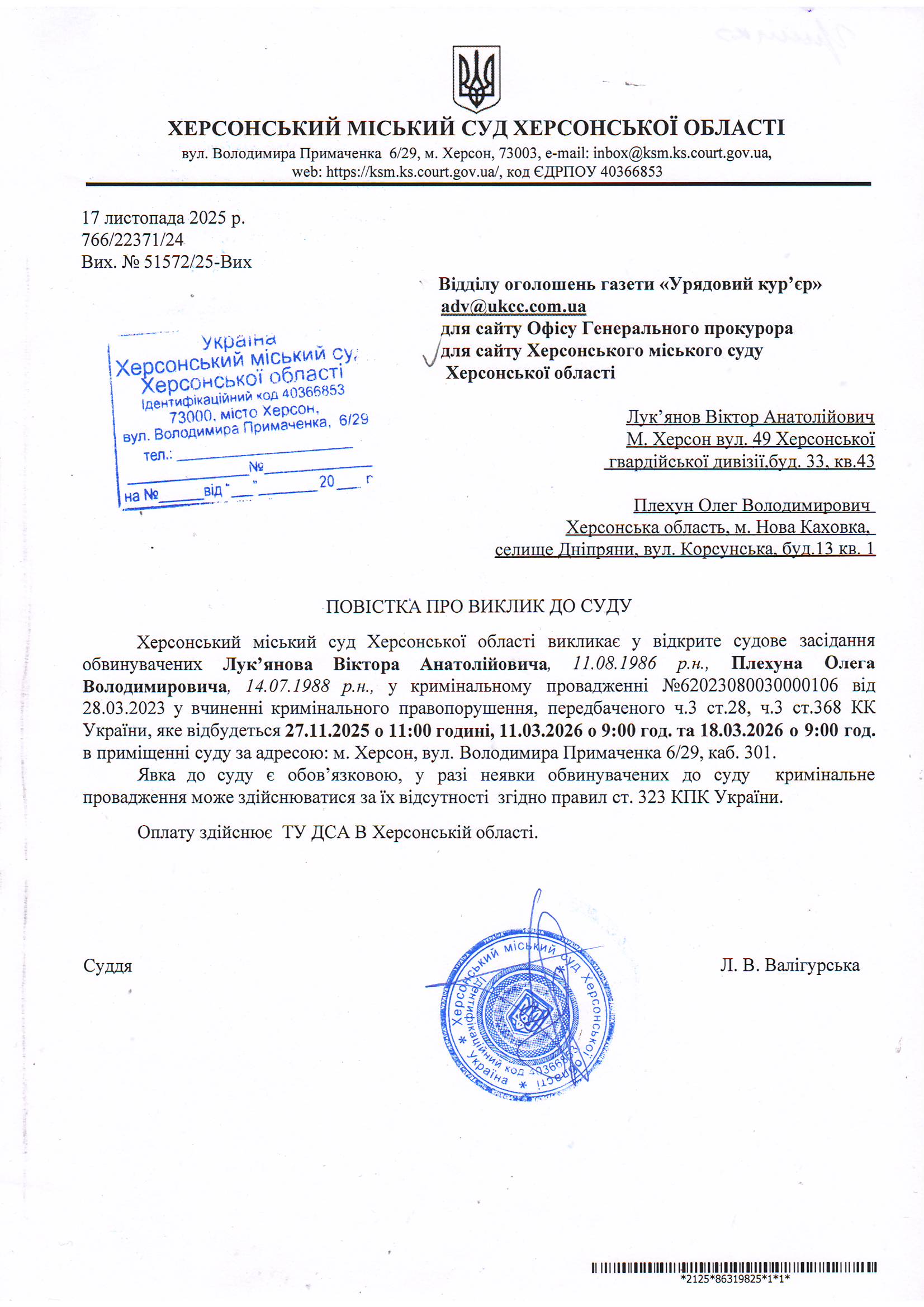 Оголошення для Лук'янова Віктора Анатолійовича, Плехуна Олега Володимировича